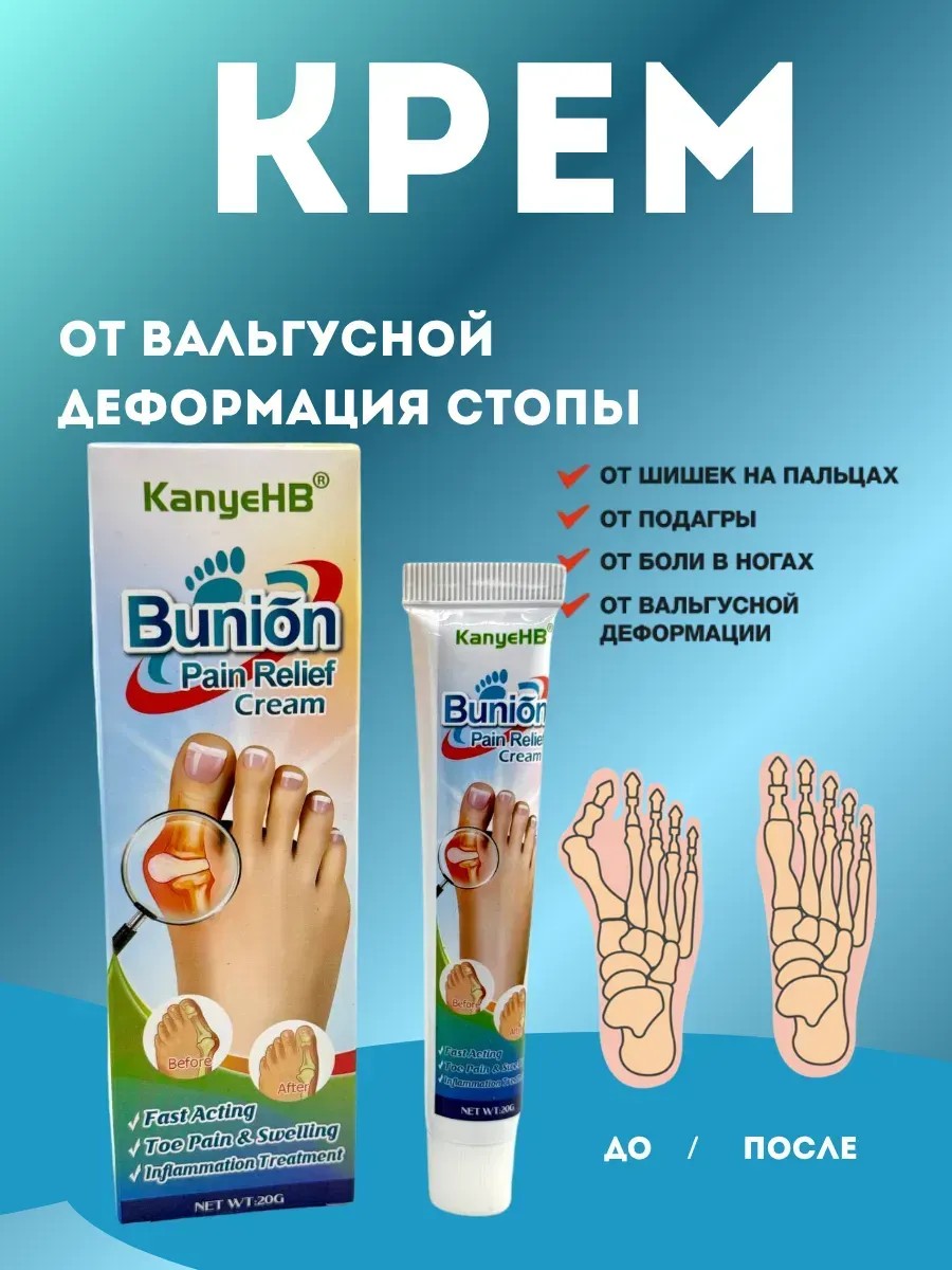 Крем от косточек на пальцах снимает боль и устраняет отек, эффективно устраняет боль и воспаление в суставах, останавливает развитие подагры и рост мозолистого образования на пальцах ног. Обезболивающий крем для ног с течением времени способствует устранению "шишки" возле большого пальца стопы. Правильное и регулярное применение позволяет снять болевые ощущения, ликвидировать воспалительные процессы, избавить стопы от боли и тяжести.