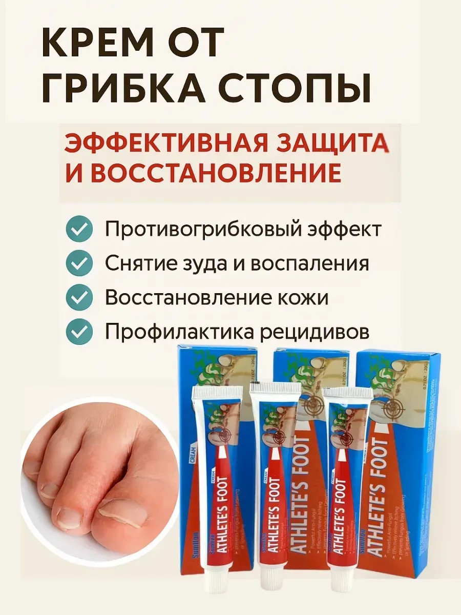 Столкнулись с зудом, шелушением и трещинами между пальцами ног? Это могут быть симптомы грибковой инфекции. Представляем средство от грибка ногтей на ногах эффективное высокоэффективный противогрибковый крем от грибка стопы, который устраняет причины и последствия микозов, избавляя от неприятных ощущений уже после первых применений.