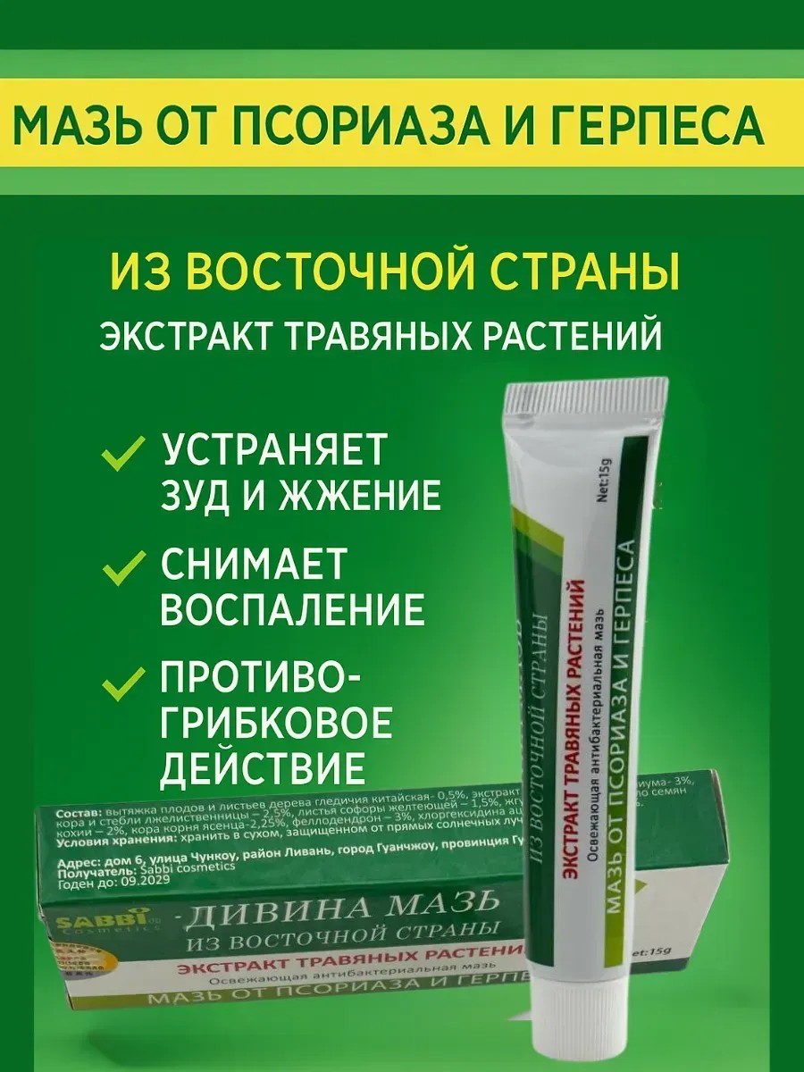Мазь на основе экстрактов травяных растений — это эффективное и безопасное средство для наружного применения, предназначенное для снятия зуда, покраснения, шелушения и раздражения кожи. Продукт используется для комплексного ухода при псориазе, герпесе, экземе и дерматите, обладает выраженными антисептическими, противовоспалительными и успокаивающими свойствами чудо мазь китайская.