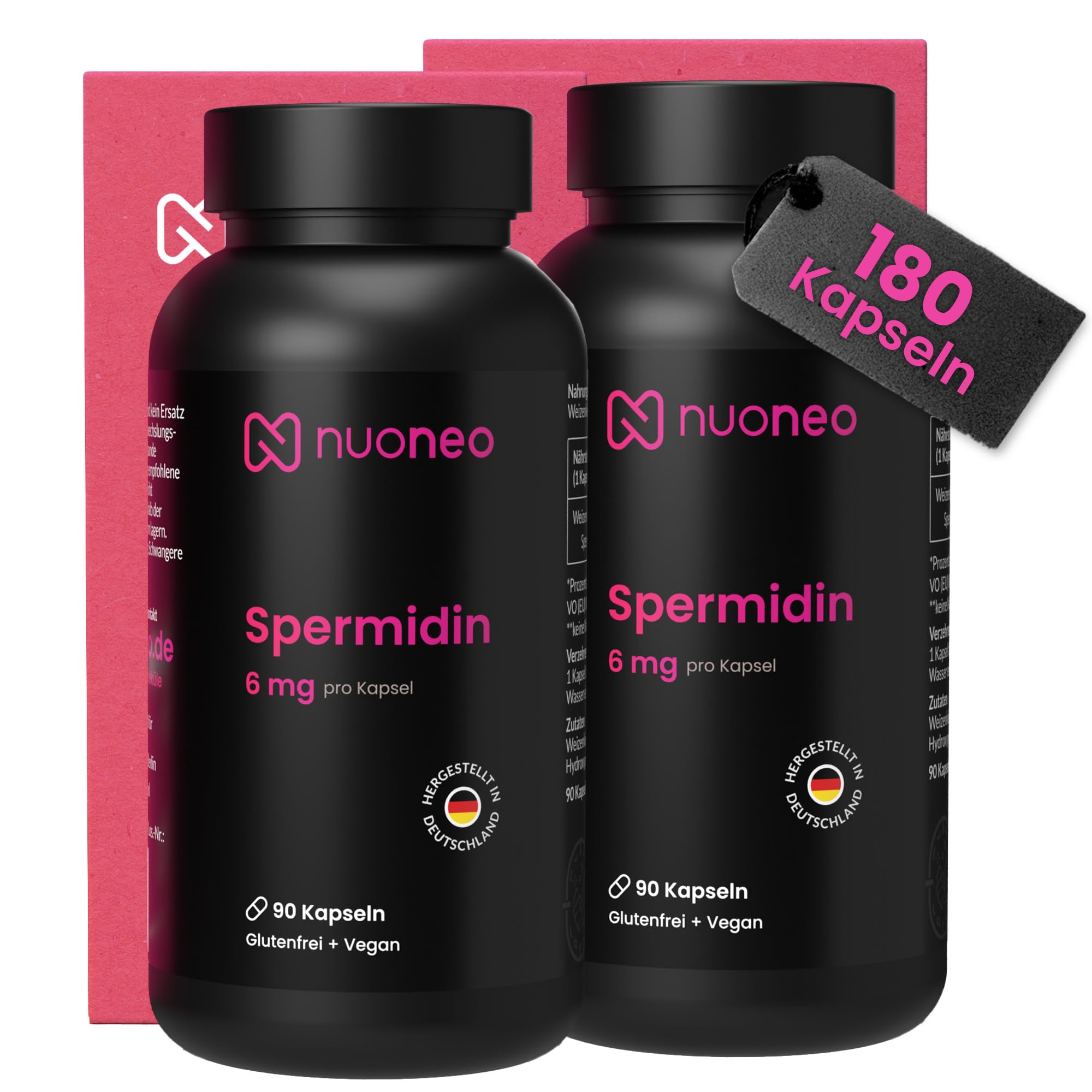 Discover nuoneo's high-dose spermidine capsules. With 6 mg of spermidine per capsule, you can meet your daily needs with just one capsule. Our spermidine capsules are manufactured in Germany and undergo strict quality control by independent laboratories. Spermidine is one of the most popular products in the field of longevity and anti-aging. The wheat germ extract in the capsules also contains 5 polyamine. Dosage: 6 mg of spermidine per capsule. Pack size: 180 capsules (6-month supply). Made in: Germany. Quality control: Independently tested by German laboratories.