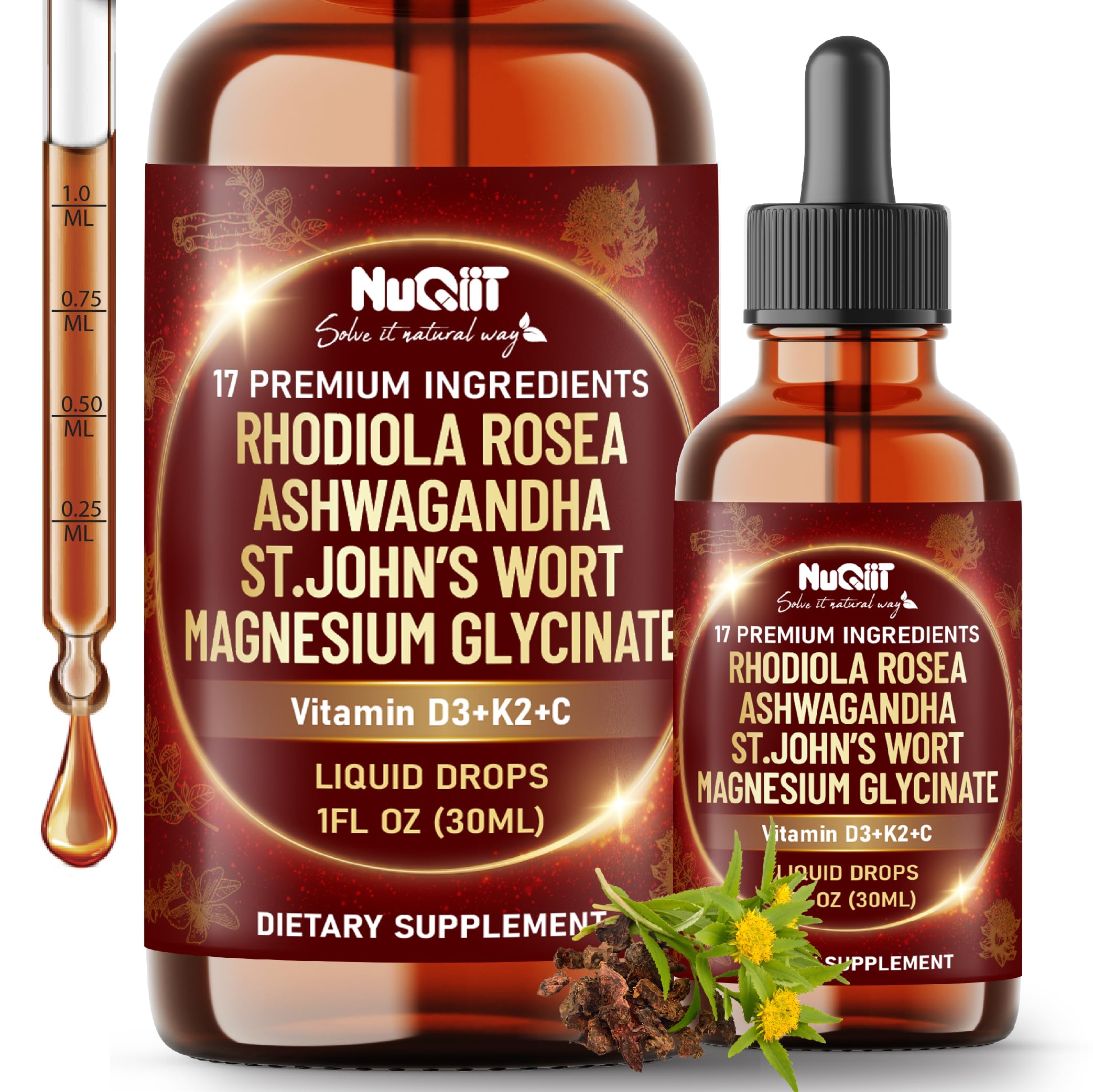 NUQIIT 17in1 Rhodiola Rosea Liquid Drops Tincture w/Ashwagandha Magnesium L-Theanine. Ultra Rhodiola Cortisol Supplement Rhodiola Root for Mood Energy - 1 FL Oz - 60 Day Supply
