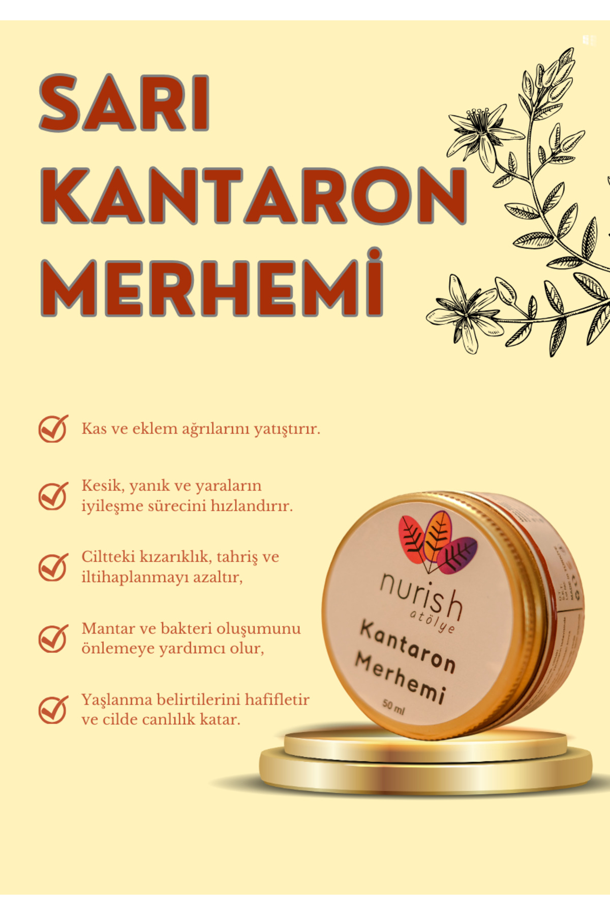 NurishAtölye, dogadan ilham alarak hazirladigi aromaterapik merhem ve karisimlarlasaglikli bir yasami desteklemektedir. Dogal içeriklerle zenginlestirilmisKantaron Merhemi, cilt bakiminiza essiz bir katki sagliyor. Içerigindeki sarikantaron yagi, balmumu, lavanta uçucu yagi ve E vitamini ile cildinizi besler, yeniler ve korur.