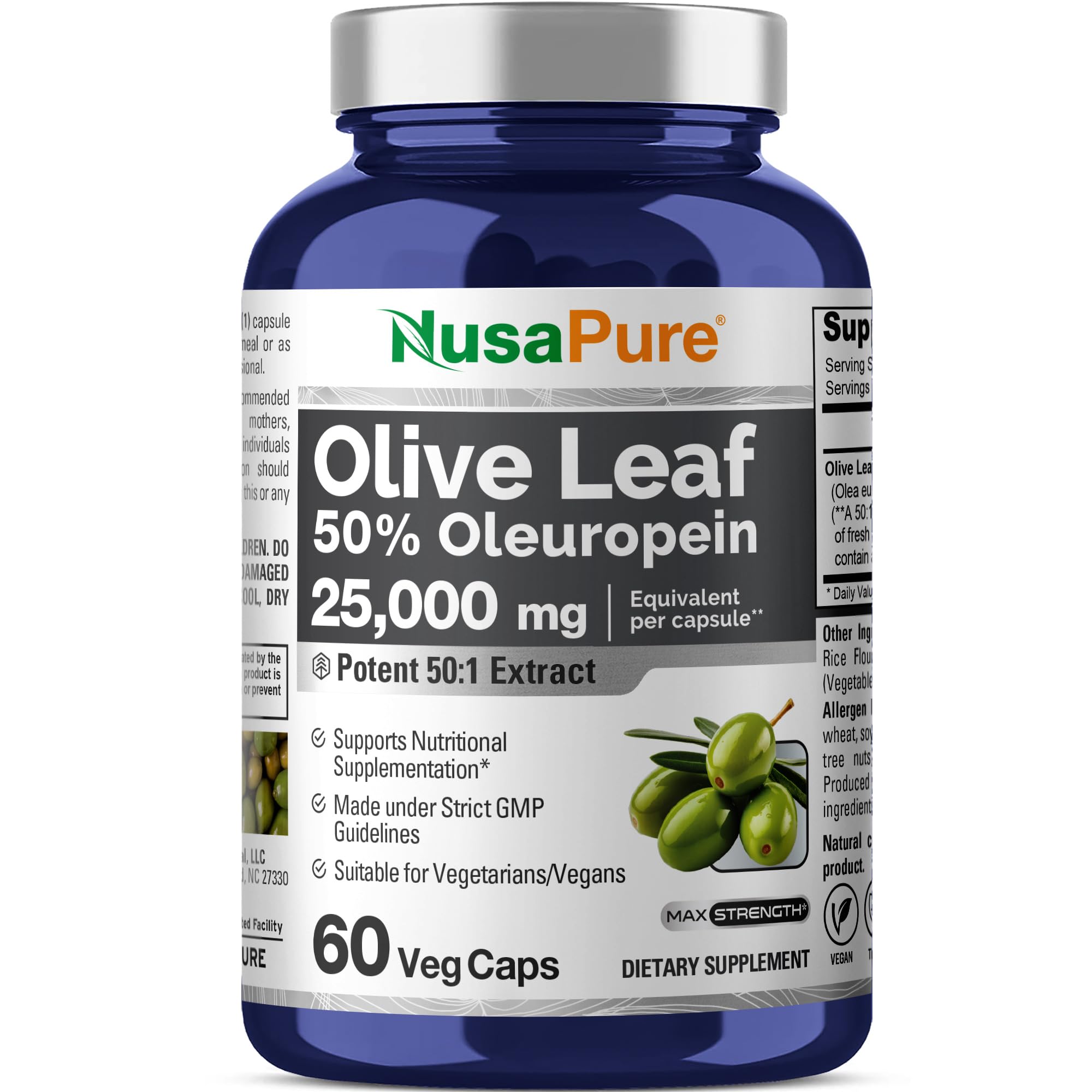 NusaPure Olive Leaf 50:1 Extract 500 mg Equivalent to 25 000mg - 50% Oleuropein Vegan/Vegetarian - Super Strength No Oil 60 Capsules 60 Count (Pack of 1)