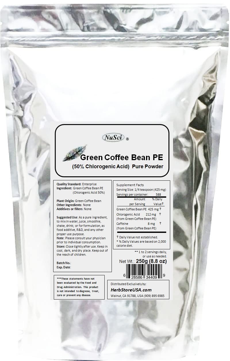 New and fresh, 1.0 2.5 years shelf life available. Bulk Ingredient for food additive, formulation, health finish product R D, cosmetic product, or any other proper purpose. Brown to yellow powder, characteristic taste, soluble in water, characteristic fragrance odor. Store in cool and dry place, keep away from strong light and heat. NuSci brand. There is not any additive or filler inside. Green Coffee Bean Extract Powder, Standardized 50 Chlorogenic Acid.