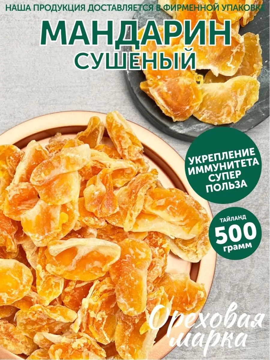 Тайский мандарин — сочное лакомство с ароматом свежести. В нем есть и дразнящая экзотическая сладость, и приятная кислинка - то, что нужно для изысканного удовольствия. И все это с пользой для фигуры - минимум калорий, максимум пользы. Сочетание витамина С и аскорбиновой кислоты повысит защитные силы организма, поможет сохранить остроту зрения и приведет в норму обмен веществ, придаст сияние коже, мгновенно поднимет настроение и сделает любой день особенным! Подарите себе новые ощущения! Доказано, что мандарины оказывают благотворное воздействие на женскую красоту и мужскую силу, сердце и нервную систему. Натуральные кусочки из сушеного мандарина без сахара идеально подходят любителям диетической и постной еды, а также незаменимый вегетарианский и веганский продукт, надежный друг любителей спорта и тех, кто предпочитает физические нагрузки. Вяленый мандарин это правильная и полезная сладость, которую можно положить с собой в ланч бокс или шопер, используя для здорового перекуса как фитнес или спортивный батончик, и отправиться на тренировку. Дольки сушеного мандарина незаменимая вещь во время учебы в школе, как полезный перекус для детей. Этот сухофрукт бесценно важен тем, кто предпочитает правильное и здоровое питание каждый день. Отборные сухофрукты из мандарина могут быть отличным дополнением сладкого и вкусного подарка бокса девушке, маме, папе, подруге или учителю, отлично подойдет к подарку на любой праздник 8 марта, день рождения, юбилей, новый год. Здоровое питание каждый день — это просто! Бренд «Ореховая Марка» — полезный перекус на каждый день: орехи, сухофрукты, веганские продукты для взрослых и детей, беременных, веганов и вегетарианцев, диабетиков и тех, кто выбирает здоровое питание каждый день. «Ореховая Марка»- новый стандарт качества и свежести: расфасовка отборного товара в эко-упаковку в день заказа. Каждый заказ проходит тщательную проверку на всех этапах: от фасовки до транспортировки, поэтому мы гарантируем высокое качество! Сухофрукты и орехи по-настоящему свежие, полезные и вкусные. Все только лучшее и только для Вас! Широкий спектр лакомств на любой вкус: вкусняшки в шоколаде, в глазури, в меду, конфеты, печенье, сушеные и вяленые сухофрукты, продукты без сахара, цукаты и фруктовые дольки для выпечки, кислые корки цитрусовые засахаренные, наборы в подарок и другие восточные сладости для чая. Наша продукция подходит тем, кто придерживается пп-принципов, на диете, предпочитает полезный перекус без ГМО и глютена, подходит при похудении.