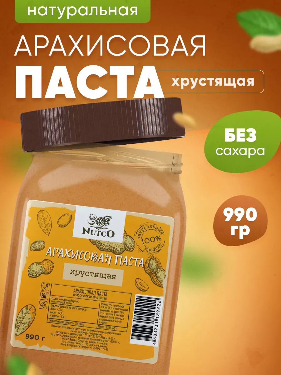 NUTCO Арахисовая паста без сахара с кусочками хрустящая 990 г