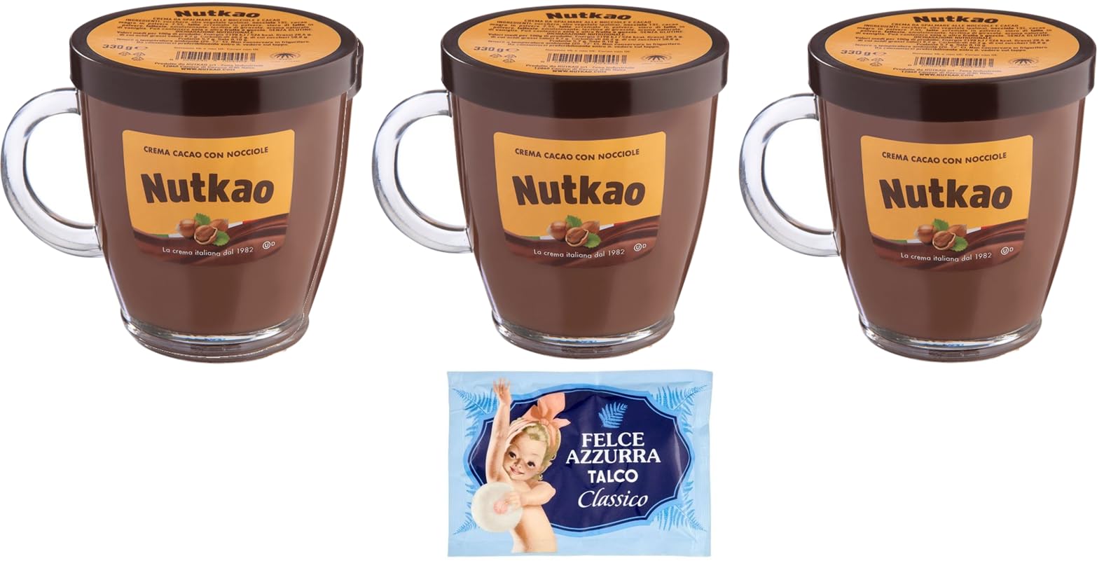 Nutkao Crema Cacao con Nocciole Pack of 3 hazelnut cocoa spread creams Italian cream 330g jar + 1 free Felce Azzurra talc sachet 100g