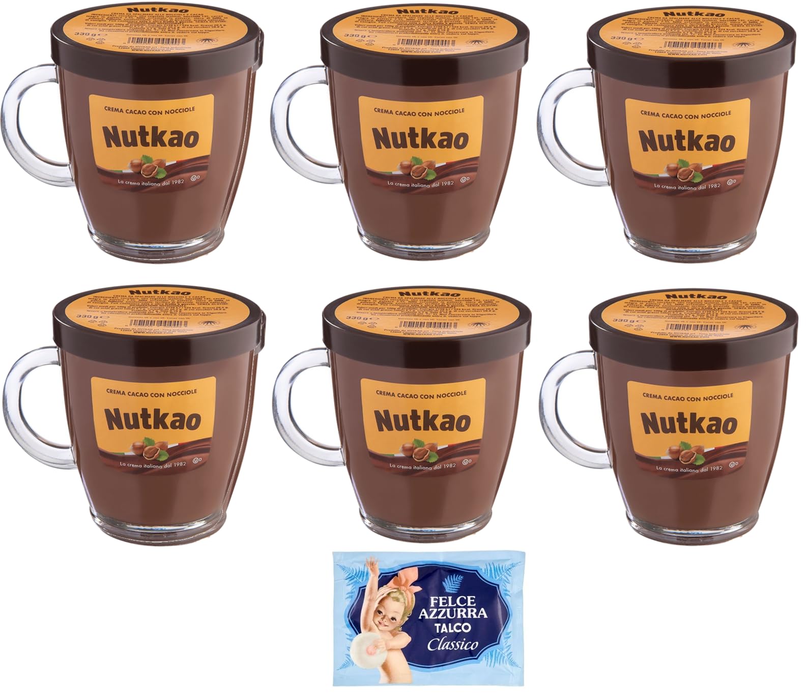 Nutkao Crema Cocoa con Nocciole Spreadable Cream with Hazelnuts Italian Cream 330 g Jar + 1 Free Felce Azzurra Talcum Powder Bag 100 g (Pack of 6)