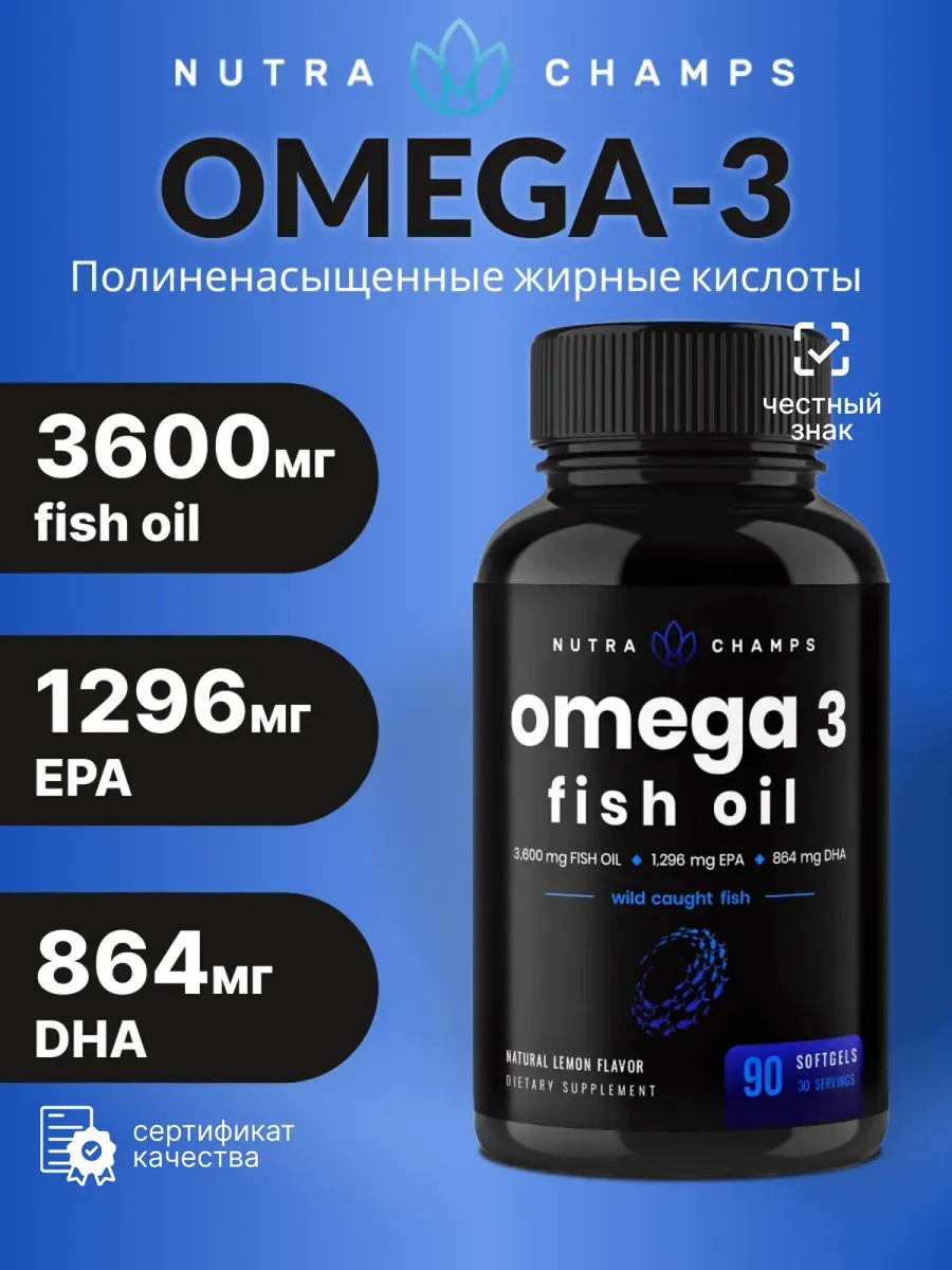 Рыбий жир омега-3 является основным продуктом ежедневного питания. Это одна из самых полезных добавок, доступных для здоровья сердца и мозга, комфорта суставов, глаз и многого другого! Рыбий жир Омега-3 от NutraChamps получают естественным путем из свежей рыбы, выловленной в дикой природе, он сверхчистый и очищается с помощь усовершенствованного процесса молекулярной дистилляции. В результате получается одна из самых высоких концентраций EPA и DHA на рынке на сегодняшний день. Рыбий жир, полученный из тканей жирной рыбы, является одним из самых мощных источников жирных кислот Омега-3, доступных на сегодняшний день. ЭПК, и ДГК являются Омега-3 жирными кислотами, хотя они играют разные роли в организме.Рыбий жир NutraChamps богат Омега-3 жирными кислотами эйкозапентаеновой кислотой (EPA) и докозагексаеновой кислотой (DHA). Они действуют синергически в организме, поскольку ЭПК поддерживает иммунную систему, сердце и воспалительные процессы, в то время как ДГК поддерживает мозг, глаза и центральную нервную систему. Омега3 улучшает комфорт и подвижность суставов, поддерживает здоровье сердца и работу мозга,поддерживает здоровье кожи, глаз и зрения