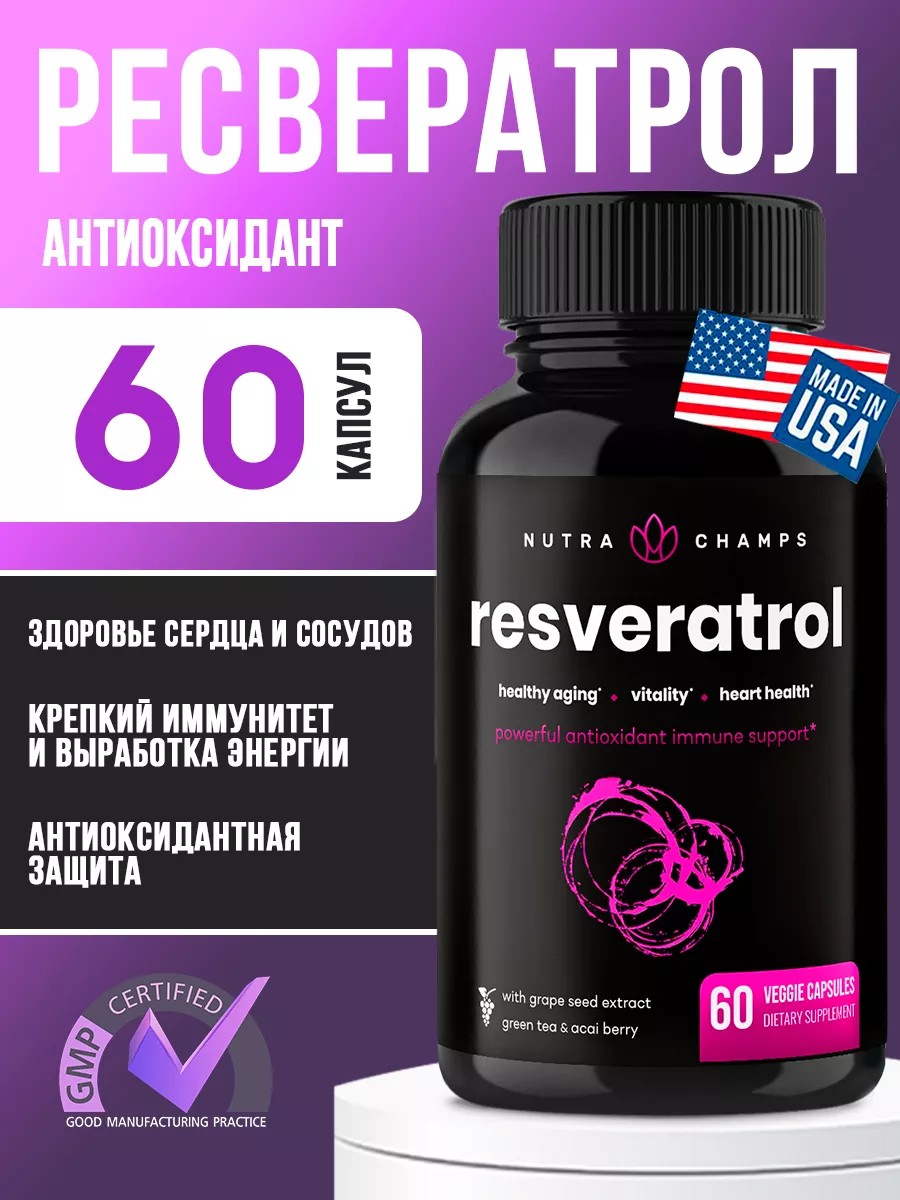 Ресвератрол бренда Nutra Champs — это мощный антиоксидант, который помогает поддерживать здоровье и молодость организма. Он обладает свойствами, способствующими омоложению и повышению долголетия. Эта биологически активная добавка предназначена как для мужчин, так и для женщин, обеспечивая поддержку и укрепление иммунитета, а также здоровье сердца и сосудов.