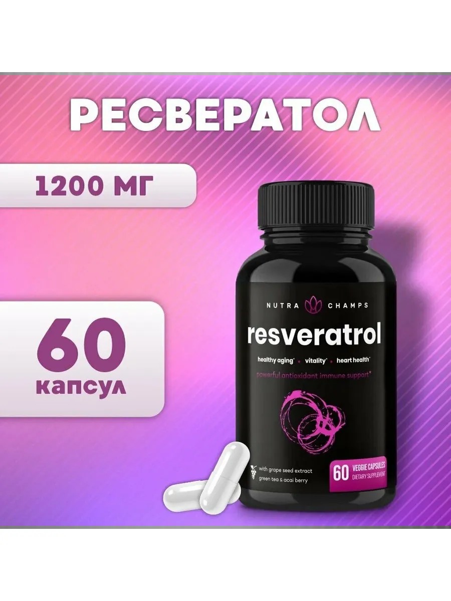 Ресвератрол мощный антиоксидант, поддерживает общий тонус организма, замедляет старение, защищает сердечно-сосудистую и нервную систему. Биологически активная добавка Ресвератрол натуральный препарат для поддержания здоровья организма, защиты сердечно-сосудистой и нервной систем. В состав витаминного комплекса входят необходимые микроэлементы и минералы. Пищевая добавка resveratrol это мощный антиоксидант, активность которого превосходит витамин Е, предупреждает развитие атеросклероза и ишемической болезни сердца, восстанавливает память, улучшает работу мозга, тонус, концентрацию внимания. Его используют как детокс бад для очищения организма от шлаков и токсинов. Мультивитамины нормализуют давление, благоприятно сказываются на работе сердца, сосудов, нервной системы. Биологический комплекс улучшает кровообращение, нормализует показатели крови, предупреждает образование тромбов в сосудах, снижает уровень холестерина в крови, укрепляет стенки сосудов, нормализует работу клеток организма, подавляет клеточные процессы, ведущие к развитию онкологии, рака. Поливитамины обладают anti age омолаживающим эффектом, применяются для поддержания молодости, красоты, свежести, здоровья кожи, волос, ногтей, замедляют процессы старения. \\n\\nЗдоровое старение\\nЖизнеспособность \\nЗдоровье сердца\\nМощная антиоксидантная поддержка иммунитета\\nС экстрактом виноградных косточек, зеленым чаем и ягодами Асаи\\nПищевая добавка\\nКачество соответствует требованиям GMP \\nПроверено в лаборатории\\nНе содержит ГМО\\nВеган\\nСделано с любовью\\nБез глютена, сои, яиц, молочных продуктов, орехов и продуктов животного происхождения\\nПрибавьте жизни к Вашим годам \\nПовышение иммунитета и жизненного тонуса\\nФормула ресвератрола 5 в 1\\nРекомендации по применению\\nПринимайте по 2 капсулы в день или по указанию вашего лечащего врача.\\n\\nИнгредиенты\\nКапсула из метилцеллюлозы (вегетарианская).\\n\\n\\nРазмер порции: 2 капсулы\\nКоличество порций в упаковке: 30\\n\\nКоличество в одной порции: % от дневной нормы*\\n Витамин С (в виде L-аскорбиновой кислоты) 40 мг 44% \\n Ресвератрол (Стандартизированный до 50% чистого ресвератрола из экстракта корня Polygonum cuspidatum) 1200 мг ** \\nЭкстракт ягод Асаи (Euterpe oleracea) в соотношении 10:1 (эквивалентно 650 мг ягод асаи)\\n65 мг ** \\nЭкстракт виноградных косточек 60 мг ** \\nЭкстракт листьев зеленого чая 50 мг ** \\n** Суточная норма (DV) не установлена.