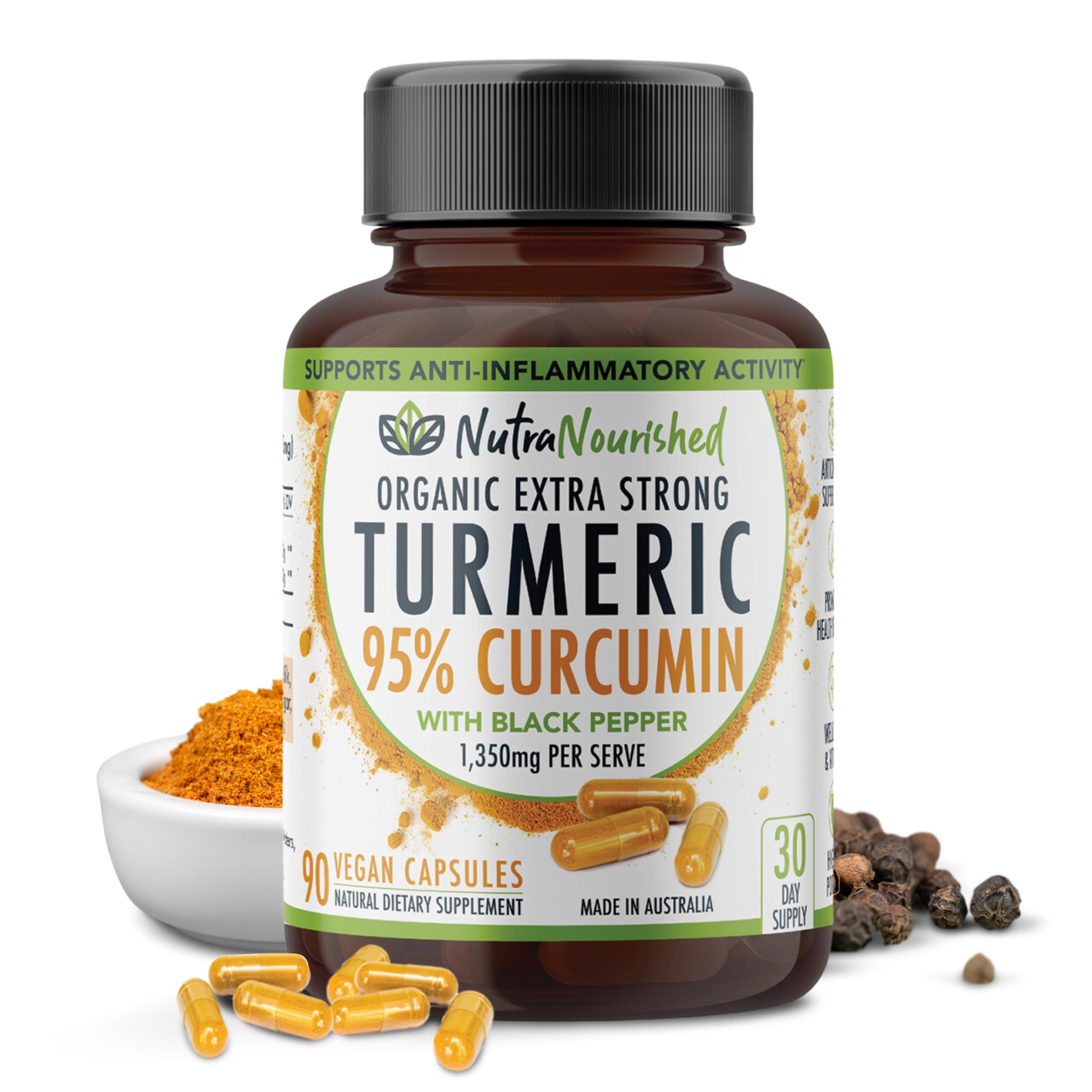 Nutra Nourished Organic Turmeric Curcumin with Black Pepper - 1350mg Standardized Turmeric 95% Curcumin| Highest Strength Curcumin Curcuma Capsules | Made in Australia (90 Capsules)