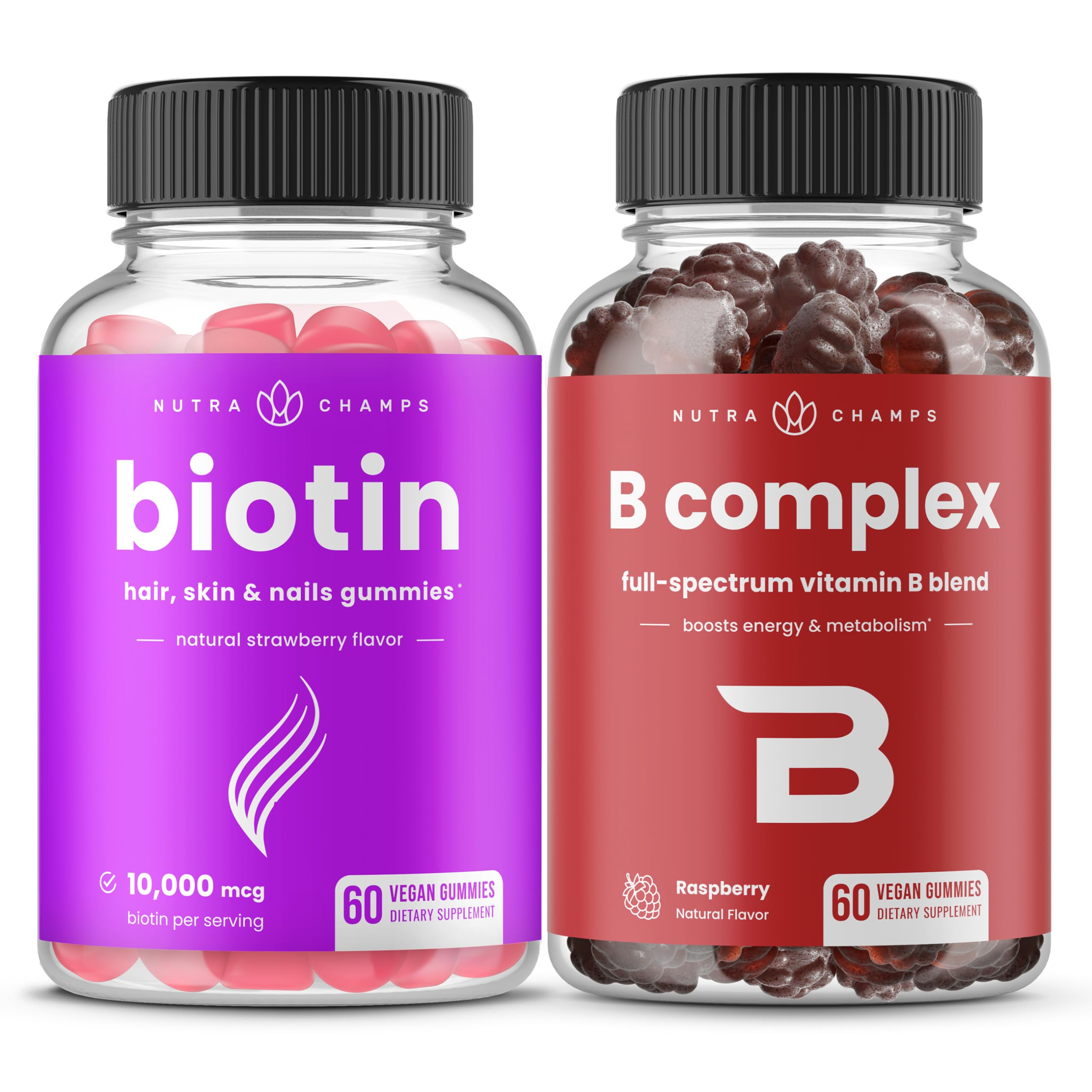 Bundle Save - NutraChamps best-selling products are now available in a bundle! Enjoy our Biotin B Complex duo at even better prices!. Smooth Energy, Calm Mind Healthy Metabolism - Vitamin B helps convert food into cellular energy, maintain nervous system health support the body's ability to manage stress, resulting in healthy energy levels improved mood. Healthy Hair, Skin Nails - Caring for your hair, skin and nails is not just about what kind of products you use on the outside, but also about what nutrients you put into the inside of your body. NutraChamps Biotin helps you address an internal vitamin deficiency so that you can enjoy strong nails, tight, glowing skin and thick, full and healthy hair!. Complete Vitamin B Blend - This full-spectrum formula includes all 8 types of B-vitamins. For a tasty and fun way to give your body a boost, just munch a couple gummies!. Effective Easy - With 10,000 mcg of pure biotin in each serving, NutraChamps' Biotin Gummies delivers the potent effective dose of biotin that you've been looking for. Enjoy all the amazing benefits of biotin in the form of a convenient, great tasting gummy — with no tough pill to swallow. Designed for practical and easy on-the-go supplementation for men, women, and children.
