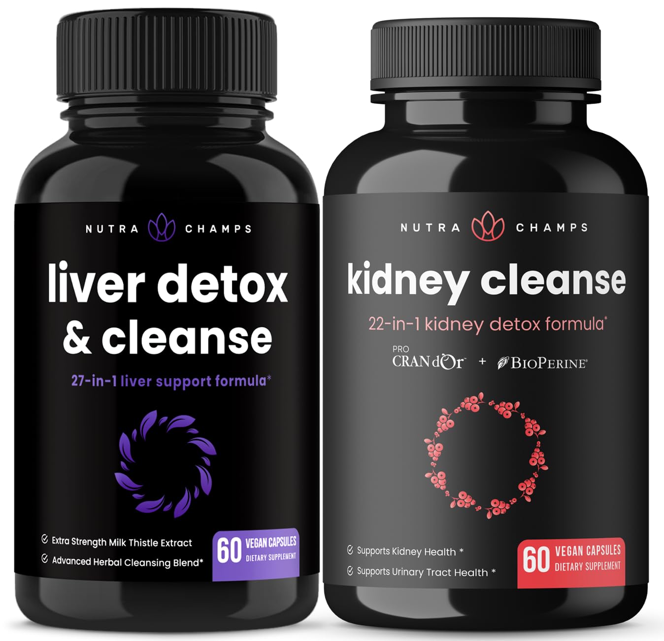 All NutraChamps supplements are manufactured in a state-of-the-art cGMP facility, and lab tested to guarantee that you receive the purest, safest and highest quality products on the market. Kidney Cleanse Detox Repair 22-In-1 Kidney Health Supplement Extra Strength 50:1 Cranberry Extract with Bioperine for Increased Absorption Kidney Urinary Tract Support Flush Formula. Liver Cleanse Detox Repair Milk Thistle Extract with Silymarin 80 , Artichoke Extract, Dandelion Root, Chicory, 25 Herbs Premium Liver Health Formula Liver Support Detox Cleanse Supplement Visit the NutraChamps Store. Bundle Save - NutraChamps best-selling products are now available in a bundle! Enjoy the Liver Cleanse Capsules and Kidney Cleanse Capsules Bundle at even better prices!.