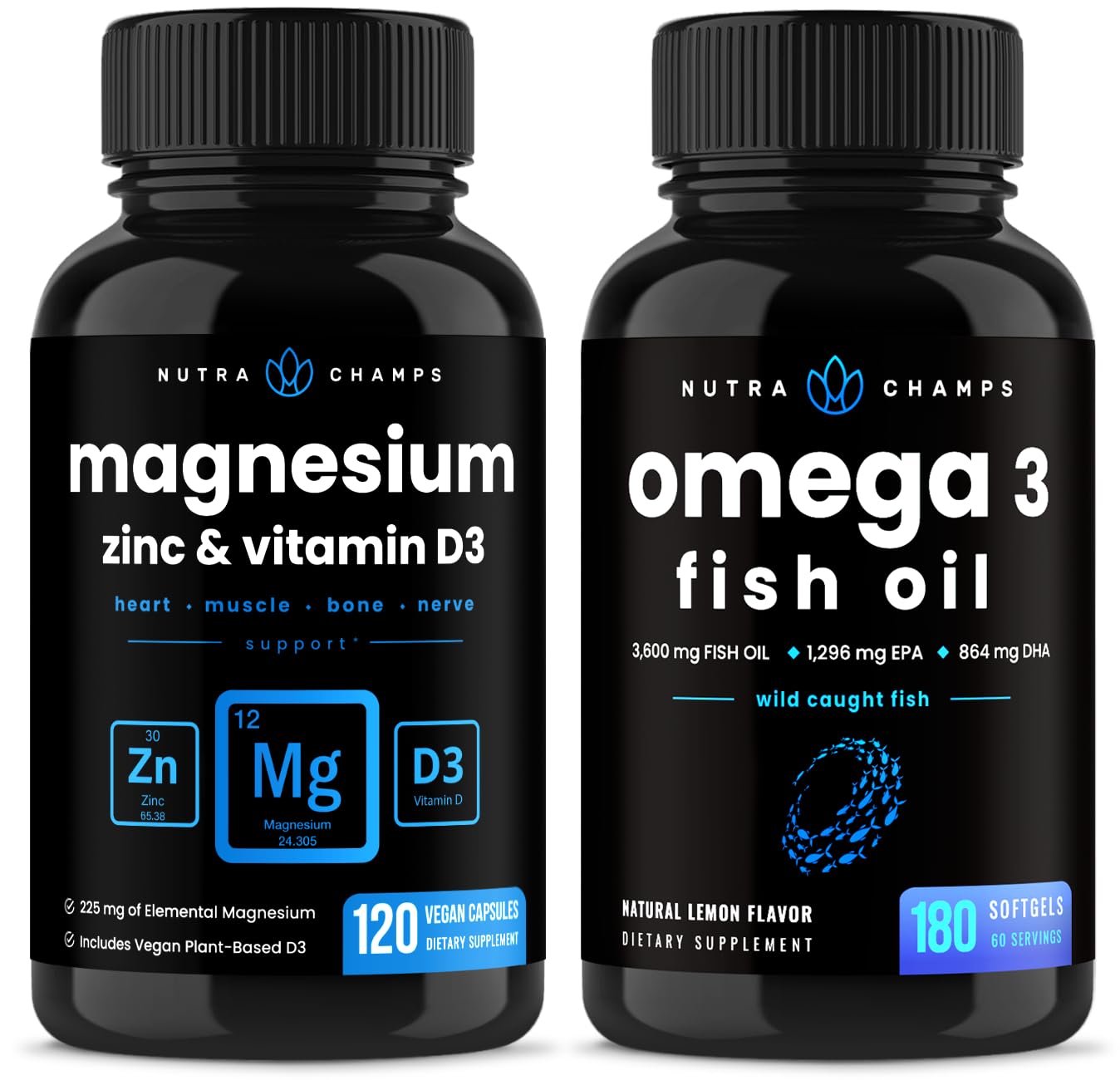All NutraChamps supplements are manufactured in a state-of-the-art cGMP facility, and lab tested to guarantee that you receive the purest, safest and highest quality products on the market. Omega 3 Fish Oil Supplements 3600mg with EPA DHA High Potency Omega 3 Supplement to Support Heart, Brain, Joints, Skin, Eyes Immune Health 180 Natural Lemon Burpless Fish Oil Capsules. NutraChamps Magnesium Zinc Vitamin D3 Supplement - Most Bioavailable Forms Magnesium Glycinate, Malate, Citrate - Bone, Muscle Heart Health, Immune Support - 120 Vegan Capsules. Bundle Save - NutraChamps best-selling products are now available in a bundle! Enjoy the Magnesium Zinc Vitamin D3 Capsules and Omega 3 Fish Oil Capsules 2 Pack Bundle at even better prices!.