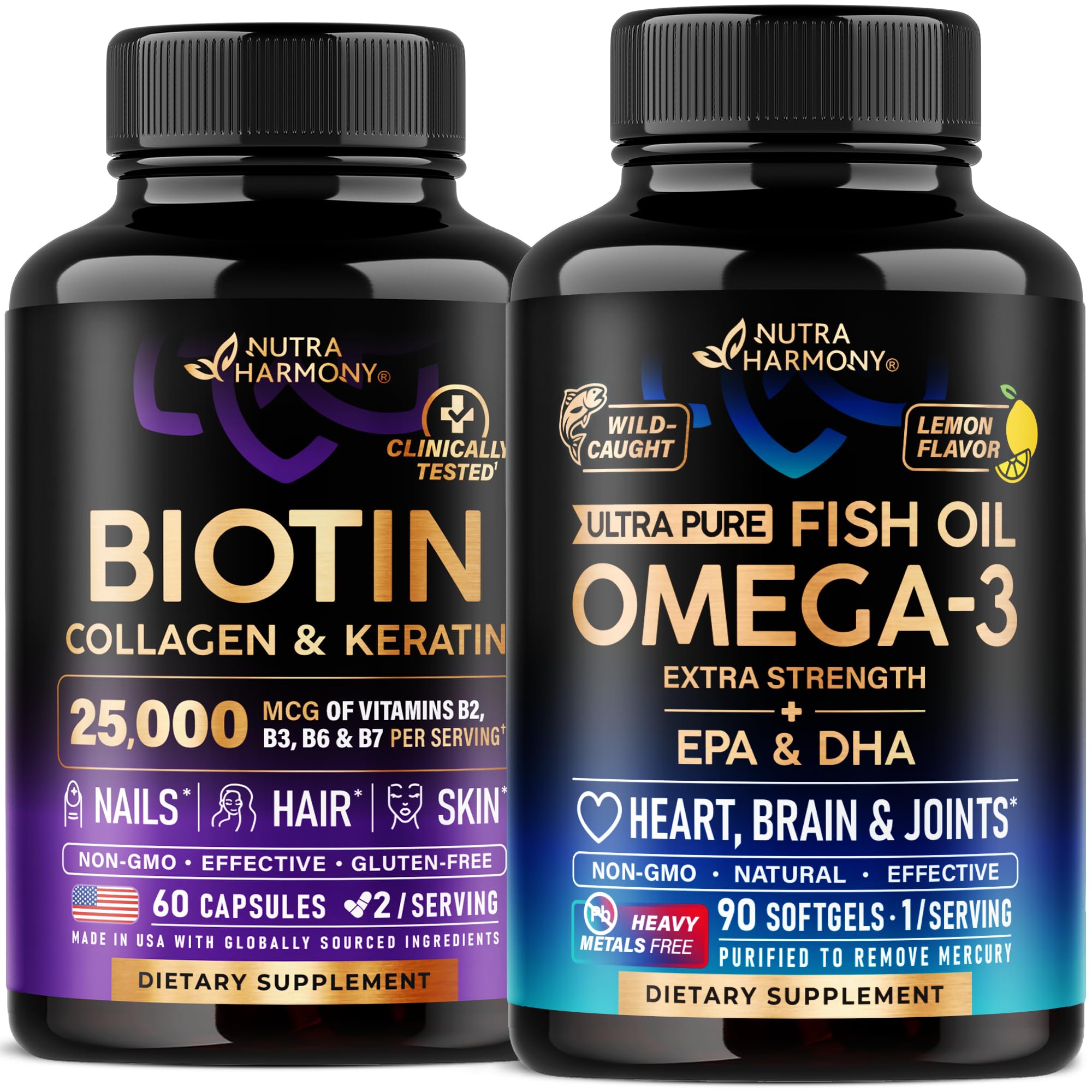 NUTRAHARMONY Biotin Collagen Keratin Capsules & Omega 3 Fish Oil Softgels