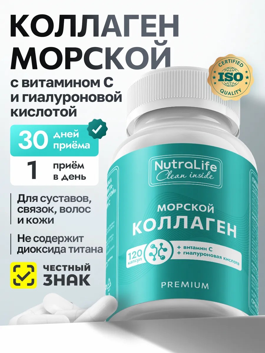 Коллаген морской в капсулах — это ваш надежный союзник в поддержании здоровья и красоты. Если вы хотите подарить своему организму заботу и поддержку, то морской коллаген с витамином С и гиалуроновой кислотой станет вашим верным помощником! Этот натуральный коллаген пептидный гидролизованный морского происхождения I типа в удобных капсулах поможет вам сохранить красоту и здоровье. Коллаген для суставов, костей и связок — это залог вашей активности и подвижности. Морской коллаген в капсулах, обогащенный гиалуроновой кислотой и витамином С, позаботится о вашей коже, волосах и ногтях, делая их здоровыми и сияющими. Капсулы легко усваиваются организмом благодаря своей форме. Банка с 120 капсулами обеспечит вам курс приема надолго. NutraLife Морской коллаген с витамином С и гиалуроновой кислотой — это простой способ заботиться о себе ежедневно! Включение витамина C способствует улучшению синтеза собственного коллагена организма, что особенно важно для женщин стремящихся к сохранению молодости кожи. Витамин C также играет важную роль в укреплении иммунной системы. Для женщин этот продукт станет незаменимым помощником не только для поддержания красоты кожи лица, но также для укрепления волос от выпадения благодаря содержанию необходимых питательных веществ. Регулярное употребление данного продукта способствует улучшению состояния суставов за счет повышения эластичности тканей связок. Это особенно актуально для тех кто ведет активный образ жизни или занимается спортом на регулярной основе. Морской источник этого продукта гарантирует высокую степень чистоты ингредиентов без добавления искусственных компонентов или консервантов что делает его безопасным даже при длительном применении.