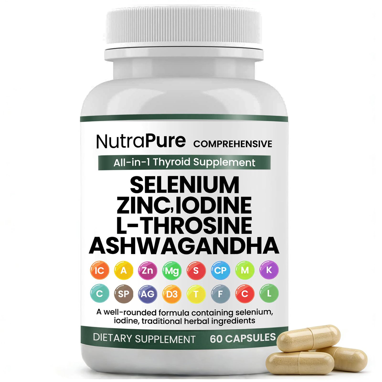NOTE - Consistency is key—for best results, take it at the same time every day and make sure to drink plenty of water throughout the day. HOW TO TAKE - Take 2 capsules daily with a meal for optimal absorption. CLEAN PURE Free from synthetic fillers, harsh ingredients, artificial colors, or unnecessary additives. Vegan formula, never tested on animals. ALL-IN-1 POWERFUL INGREDIENTS - Contains 300 mcg of Selenium, 500 mcg of Iodine, 500 mg of L-Tyrosine, 6000 mg of Ashwagandha, and numerous trace elements and minerals. COMPREHENSIVE SUPPORT - One capsule provides multiple nutrients, conveniently and effectively addressing the root cause of the problem.