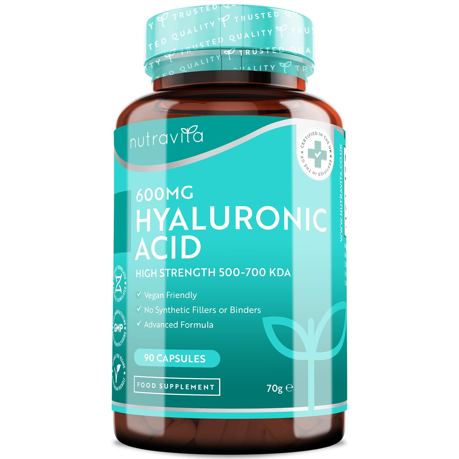 ✓ Customer satisfaction comes first - the full satisfaction of our customers is always very important to us, as a trustworthy brand since 2014.If it should still happen that you are dissatisfied with our product or have questions about our products and service, please feel free to contact us.Our very helpful customer service team will answer your question within a very short time.✓Jede production hinge is tested - our manufacturer has achieved a BRC certification of the level AA, which is the highest possible level for an announced examination process.This ensures that every production hinge and every single ingredient is tested so that we can only offer our customers high quality products.In addition, we have our products checked by an independent according to DIN EN ISO IEC 17025 certified German laboratory (see product image).✓ Ingredients in premium quality: Our Hyaluron capsules are vegan or vegetarian.The product does not contain any artificial color or aroma substances, fillers, binders or Mangesium stearate.We only use the highest quality ingredients that are free of GMO and allergens.✓ 500 - 700 KDA - KDA stands for kilodalton and, so to speak, refers to the molecular mass of hyaluronic acid.Our hyaluron capsules contain the molecular size 500 - 700 kda, which corresponds to an optimal value.Attention: Many other brands offer lower molecular sizes, which can affect the water -binding property of hyaluronic acid.✓ Excellent price-performance ratio-each capsule contains an extra high dosage made of 600 mg hyaluronic acid.The 90 vegan hyaluron capsules per bottle provide them for about 3 months, which offers Nutravita an excellent and better price-performance ratio than the competition.✓ KUNDENZUFRIEDENHEIT STEHT AN ERSTER STELLE - Die volle Zufriedenheit unserer Kunden ist uns, als eine vertrauenswürdige Marke seit 2014, immer sehr wichtig. Falls es dennoch dazu kommen sollte, dass Sie mit unserem Produkt unzufrieden sind oder Fragen rund um unsere Produkte und Service haben, können Sie sich gerne jederzeit bei uns melden. Unser sehr hilfsbereites Kundenservice-Team wird Ihre Frage innerhalb kürzester Zeit beantworten. ✓JEDE PRODUKTIONSCHARGE WIRD GETESTET - Unser Hersteller hat eine BRC-Zertifizierung der Stufe AA erreicht, was die höchstmögliche Stufe bei einem angekündigten Prüfungsverfahren ist. Dies gewährleistet, dass jede Produktionscharge und jeder einzelne Inhaltsstoff getestet wird, damit wir unseren Kunden nur hochqualitative Produkte anbieten können. Zusätzlich dazu lassen wir unsere Produkte von einem unabhängigen nach DIN EN ISO IEC 17025 zertifizierten deutschen Labor prüfen (siehe Produktbild). ✓ ZUTATEN IN PREMIUMQUALITÄT: Unsere Hyaluron Kapseln sind vegan bzw. vegetarisch. Das Produkt enthält keinerlei künstliche Farb- oder Aromastoffe, Füllstoffe, Bindemittel oder Mangesiumstearat. Wir verwenden nur Zutaten höchster Qualität, die frei von GVO und Allergenen sind. ✓ 500 - 700 kDa - kDa steht für Kilodalton und bezeichnet sozusagen die Molekülmasse der Hyaluronsäure. Unsere Hyaluronkapseln enthalten die Molekülgröße 500 - 700 kDa, welches einem optimalen Wert entspricht. ACHTUNG: Viele andere Marken bieten geringere Molekülgrößen an, was die wasserbindende Eigenschaft der Hyaluronsäure beeinträchtigen kann. ✓ AUSGEZEICHNETES PREIS-LEISTUNGS-VERHÄLTNIS – Jede Kapsel enthält eine extra hohe Dosierung aus 600 mg Hyaluronsäure. Die 90 veganen Hyaluron Kapseln pro Flasche versorgen Sie über ca. 3 Monate, wodurch Nutravita bei diesem Produkt ein ausgezeichnetes und besseres Preis-Leistungs-Verhältnis als die Konkurrenz anbietet.Nutravita 600mg Hyaluronsäure Kapseln hochdosiert - Mit 600mg pro Kapsel - 500-700 kDa – 90 Kapseln (3 Monate) - Chargengetestet und zertifiziert von einem unabhängigen deutschen Labor – Vegan