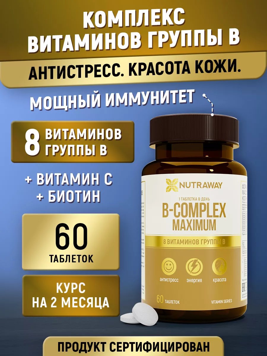 Комплекс витаминов группы B Nutraway – это высокоэффективная витаминная формула для людей, ведущих здоровый образ жизни. Преимуществом комплекса является оптимальная суточная дозировка витаминов в каждой таблетке. B-Complex maximum поможет Вам самым легким способом получить важные нутриенты. Одна капсула содержит суточную дозировку. Рекомендуется принимать БАД в период реабилитации после тяжелых инфекционных заболеваний и в комплексной терапии заболеваний кожи. Прием витаминов рекомендован для восстановлению нервной системы, укрепления иммунитета, улучшению состояния волос, ногтей и кожи лица. Недостаток этого витаминного комплекса может привести к повышенной утомляемости, раздражительности, бессоннице и ослабленному иммунитету. Также при нехватке витаминов группы B ( в б b ) отмечается повышенное выпадение волос, ломкость ногтей, существенно ухудшается состояние кожи лица. Появляется раздражение, угревая сыпь, кожа начинает шелушиться. Поэтому их регулярное употребление является неотъемлемой частью здорового образа жизни. Сбалансированный bcomplex включает в себя витамины группы В. В1 b1. В2 b2. В3 b3. В5 b5. В6 b6. В7 b7. В9 b9 В12 b12. biotin, Витамин С. Они отвечают за корректную работу нервной системы и правильное функционирование сердца и печени, эластичность суставов. Не является лекарственным средством.