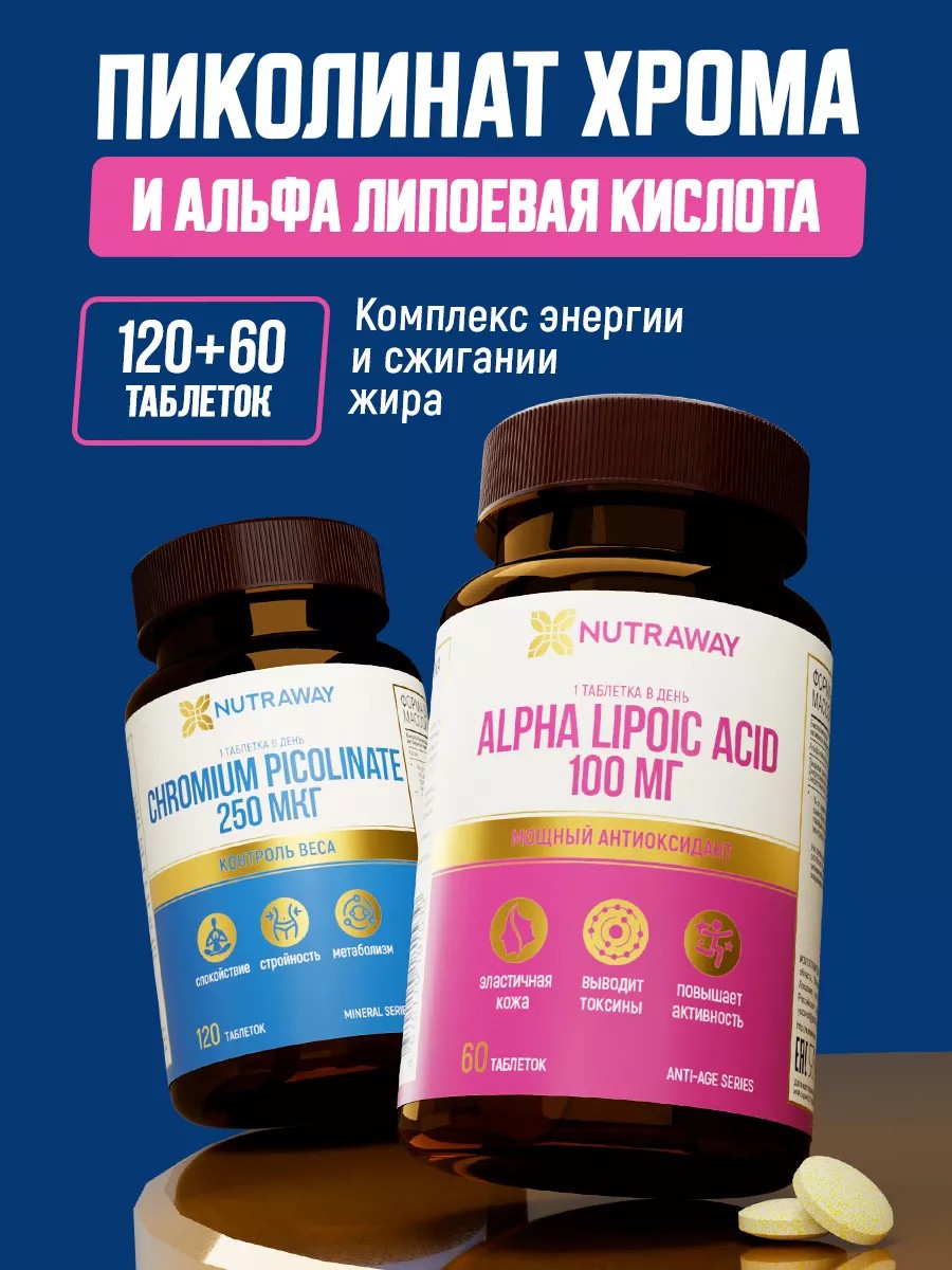 Набор витаминов Nutraway: пиколинат хрома 120 таблеток 250 мкг и альфа-липоевая кислота 60 таблеток 100 мг обеспечивают улучшение уровня энергии. БАДы усиливают действие друг друга, преумножая потенциал каждого от их совместного применения. Пиколинат хрома - способствует нормализации уровня сахара в крови, и это важный фактор в борьбе с ожирением. chromium picolinate - активно улучшает обмен веществ, способствует снижению веса и повышению метаболизма и активности организма. С другой стороны, альфа-липоевая кислота - мощный антиоксидант, оберегает клетки от свободных радикалов, являющихся одной из главных причин старения и разрушения клеток. Alpha lipoic acid помогает улучшить работу нервной системы и поддерживает здоровье печени. Контроль веса: Пиколинат хрома помогает контролировать вес, а альфа-липоевая кислота улучшает общую энергетику и метаболизм. Поддержка энергии: Оба вещества способствуют высвобождению энергии из пищи. БАД таблетки для похудения, средство для похудения и как мощный жиросжигатель, помогая активно худеть, сбросить лишний вес.