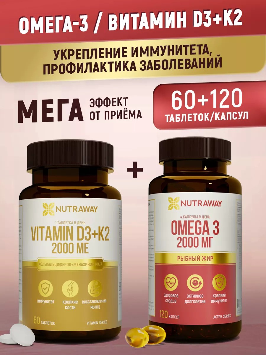 Набор витаминов для укрепления иммунитета и профилактики заболеваний:Омега-3 способствует усвоению жирорастворимых витаминов D3 и К2, которые в свою очередь необходимы для полноценного и правильного усвоения кальция. «Солнечный» витамин помогает ему всасываться в кишечнике, а витамин К2 как опытный регулировщик «направляет» минерал в костную ткань, препятствуя его отложению в сосудах, суставах и почках. Поэтому на трио омеги с витаминами D3 и К2 стоит обратить особое внимание прежде всего тем, что нуждается в поддержке прочности костей. Также наша комбинация способствует укреплению защитных сил организма и снижению активности хронических воспалительных процессов.Витамин D3 + K2 от NUTRAWAY это сбалансированный комплекс важнейших нутриентов для здорового организма. Комбинация витаминов D3 и К2 оказывает синергетический эффект, способствуя правильному усвоению кальция. Поддерживает эластичность и препятствует отложению кристаллов кальция на стенках артерий, снижает риск развития кальциноза и сердечно-сосудистых заболеваний. Предотвращает кальцификацию эластина кожи и как следствие появление морщин. Способствует активации синтеза остеокальцина — белка, повышающего минеральную плотность костей. Поддерживает здоровье, укрепляет кости и зубы, препятствует развитию остеопороза, переломов и травм, в т.ч. в период менопаузы.Витамины выполняют одинаковую функцию, но с разных ракурсов, поэтому совместный прием этих двух веществ даст более мощный результат, чем принимать их раздельно. Витамин К2 доставит кальций в нужные части организма, а D3 поможет ему усвоиться, тем самым их действия направлены на укрепление и формирование костной ткани, нормализацию артериального давления, свертываемость крови, защиту от онкологии за счет контроля процесса деления клеток. Защита иммунитета в период вирусных инфекций. Нормализует работу сердечно-сосудистой системы. Улучшает функции щитовидной железы. Способствует стабильному усвоению кальция. Восстанавливает нервную систему и снижает риск депрессии. Рекомендации по применению: взрослым по 1 таблетке в день во время еды. Продолжительность приема: 1 месяц. При необходимости прием возможно повторить. Рыбий жир - базовый элемент здорового организма. Наше тело синтезирует необходимые жирные кислоты, но в очень малом количестве. Для активной работы мозга рекомендуется поддерживать рацион с сохранением оптимального баланса жирных кислот. Поэтому важно, чтобы они поступали с пищей в виде добавок. Витамины Omega-3 - дополнительный источник полиненасыщенных жирных омега3 кислот. Витаминный комплекс содержит натуральный рыбий жир в капсулах без вредных примесей. Регулярная поддержка организма с омега-3 способствует высокой концентрации внимания, сохранению энергии и укреплению иммунитета. Сжигание жира, укрепление сердца и сосудов, повышение выносливости организма, похудение, а также укрепление кожи, волос и ногтей - все это доступно с БАД Омега3 от NUTRAWAY . Рыбий жир - универсальный компонент, который используют в комплексной поддержке организма, как витамины для женщин и витамины для мужчин. Сохраняйте баланс омега-3 кислот: добавляйте в свой рацион рыбий жир омега 3 от NUTRAWAY .НЕ ЯВЛЯЮТСЯ ЛЕКАРСТВЕННЫМ СРЕДСТВОМ.