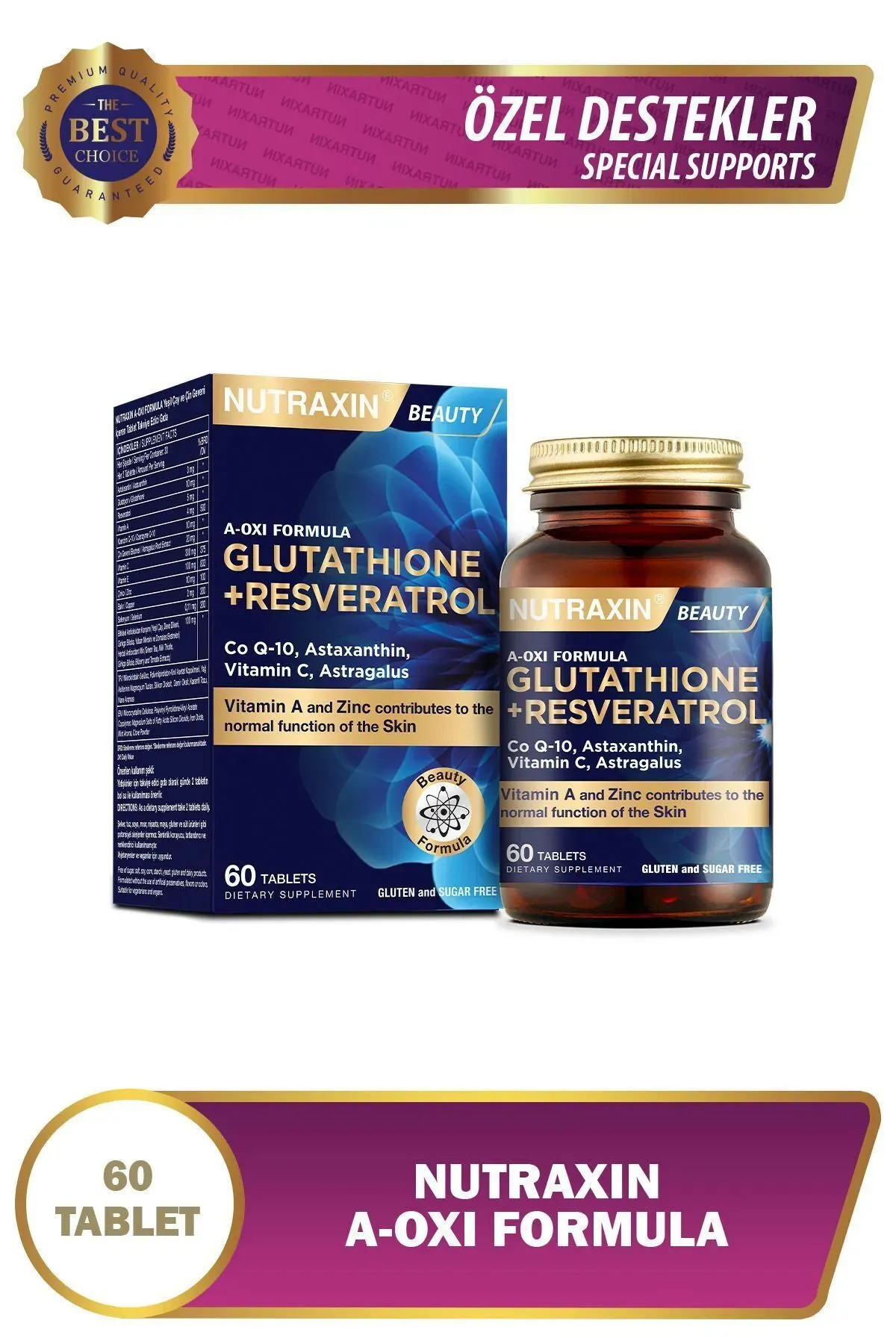 Nutraxin A-Oxi Formula Vitamin, Mineral, Bitki ekstreleri, Astaksantin, Resveratrol, Koenzim Q-10 gibi maddeler içeren 12 farkli bilesen ile güçlendirilmis bir formüle sahiptir."Çinko normal cildin korunmasina katkida bulunur.""Selenyum bagisiklik sisteminin normal islevine katkida bulunur.""C vitamini, kan damarlarinin normal fonksiyonu için gerekli olan normal kollajen olusumuna katkida bulunur."