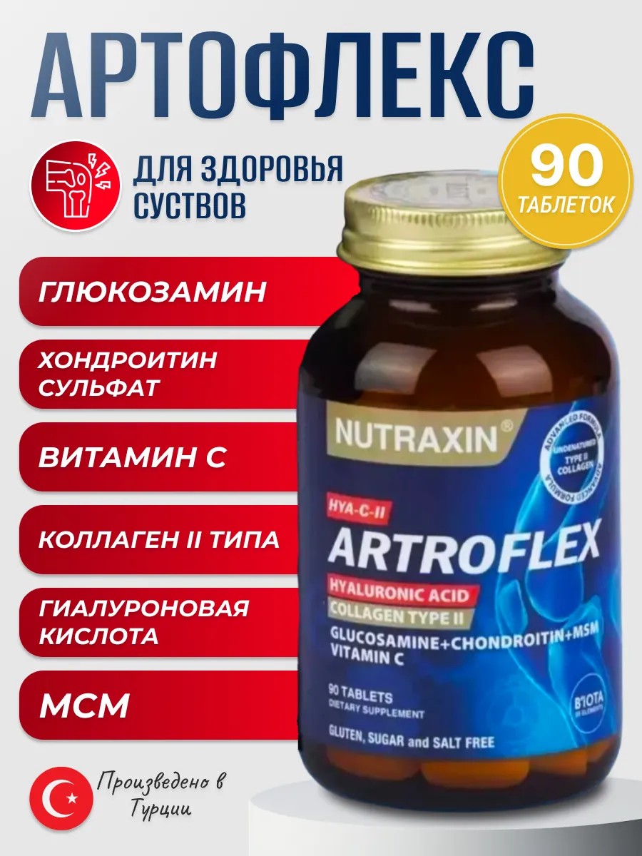 Препарат Нутраксин Artroflex Hya C-II в таблетках для суставов и связок, эффективно укрепляет опорно-двигательный аппарат, комплекс для спортсменов. БАД для опорно-двигательной системы и костей, профилактика перенапряжения мышц и болезней костей. Это специальный продукт из серии глюкозаминов, который содержит 6 активных ингредиентов: Глюкозамин, Коллаген 2-го типа, Гиалуроновая кислота, Витамин С , хондроитин , Метилсульфонилметан (МСМ). Глюкозамин - это основа в составе Артофлекс. Вещество вырабатываемое хрящевой тканью. Улучшает состояние суставов, снимает боли. Влияет на отложение кальция в костной ткани. Восстанавливает нормальную функцию суставов. Особенно улучшение и пользу глюкозамина отмечают спортсмены после травм. Ее рекомендуют при остеоартрите и других ревматологических болезнях. ОН препятствует развитию разрушительных процессов в клетках сустава.Коллаген - это белки, вырабатываемые организмом, которые отвечают за упругость и связку тканей. Именно дефицит коллагена приводит к старению кожи, костей и суставов. В нашем случае продукт содержит коллаген 2-го типа, отвечающий за гибкость и прочность суставов, а также здоровье хрящей. Коллаген данного типа рекомендуются при артрите, ревматизме и других суставных заболеваниях. Гиалуроновая кислота - это важный компонент суставного хряща и вырабатывается человеческим организмом. В каждой клетке она в виде оболочки, закрывает их и удерживает влагу. В современной медицине ее используют для лечения ревматических болезней. Важное его свойство, что она является смазкой для суставов. Витамин С в Артрофлекс или аскорбиновая кислота. Один из основных веществ в рационе человека отвечающий за функционирования соединительной и костной ткани. Поступает в организм только с пищей. Например фрукты или добавки к пище. Очень сильный антиоксидант. Помогает при болевых ощущениях в нижних конечностях. Именно поэтому она в составе Нутраксин Artroflex. Хондроитин - вещество вырабатываемый хрящевой тканью суставов. Он так же как и глюкозамин входит в состав жидкости суставов, то есть смазки. Интересно, если в этой жидкости не хватает глюкозамина образуется недостаток хондроитина. В последствие хруст в суставах и ухудшение качества смазки или синовиальной жидкости. Хондроитин снижает потерю кальция и улучшает фосфорно-кальциевый обмен в хрящевой ткани. МСМ это сера, которая вырабатывается в суставах, она помогает амортизировать силу удара при движении. Употребляется для лечения или профилактики остеоартрита. Является пищевой добавкой. Не содержит потенциальных аллергенов, таких как сахар, соль, крахмал, дрожжи. Нет в составе глютена, соя, кукуруза и молочные продукты и синтетических красителей, ароматизаторов и консервантов.