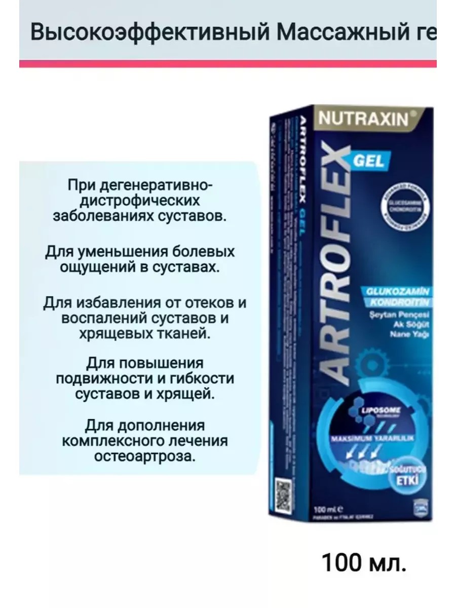НОВОЕ НАЗВАНИЕ ЭКСТРОГЕЛЬ!!!!!Преимущество геля Артрофлекс для суставов в том что она впитывается гораздо быстрее, чем мазь. Оказывает быстрое и эффективное обезболивающий и противовоспалительный действие. В составе глюкозамин, хондроитин и другие травы и растения благотворно влияющие на состояние хрящей и суставов. Без содержания парабенов и фталатов.Артрофлекс гель Нутраксин -это мазь для суставов из серии глюкозаминов, которая содержит 9 активных ингредиентов. Такие как глюкозамин, хондроитинсульфат, экстракт дьявольского когтя, белая ива и др, про которых мы подробно остановимся ниже. Мазь разработана по липосомальной технологии, то есть специальным способом доставки действующих веществ в определенные ткани.
