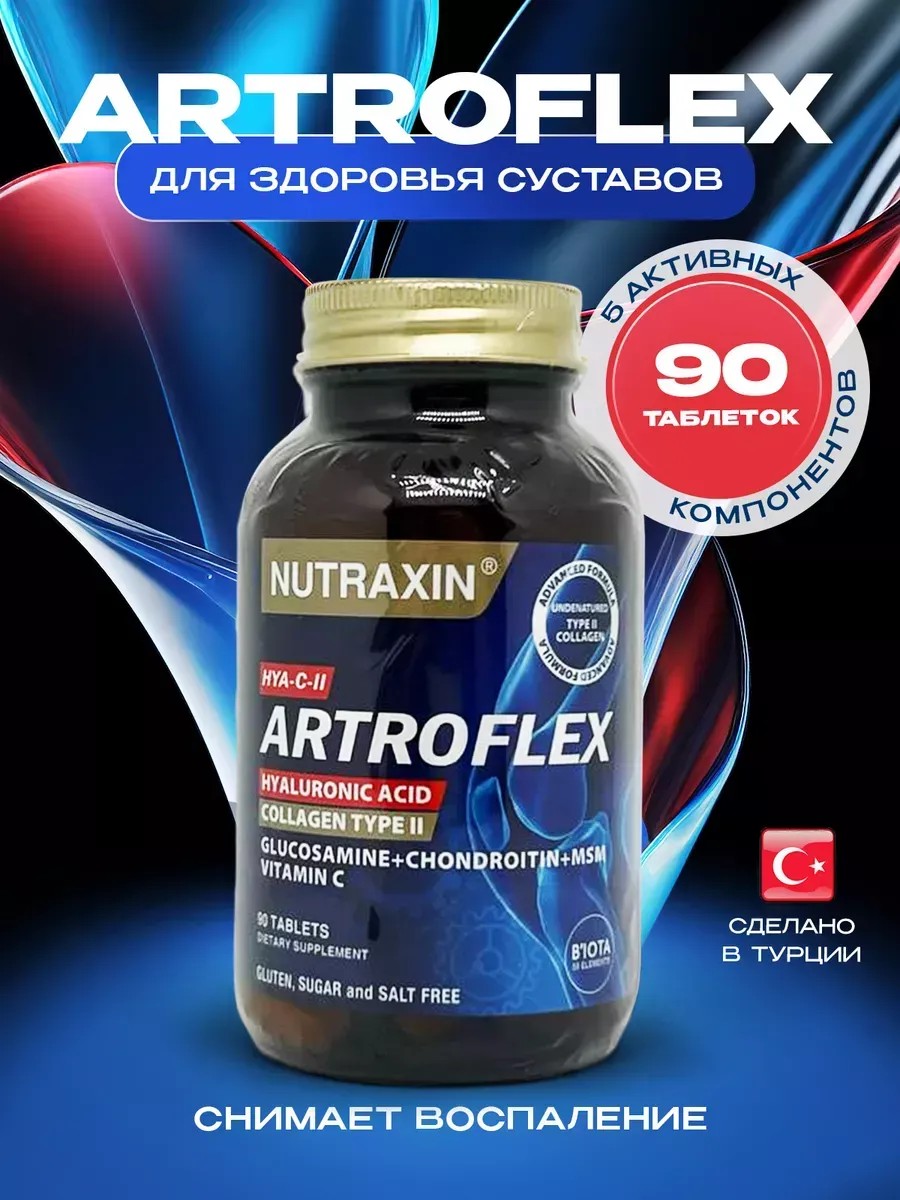Nutraxin Arthroflex Hya C-II is a specially developed, balanced dietary supplement formula from the glucosamine series. It contains 6 active ingredients that influence phosphorus-calcium metabolism in cartilage tissue, slow bone destruction, inhibit cartilage degeneration, normalize synovial fluid, improve joint mobility, are necessary for the reproduction of the main substance of bone and cartilage tissue, provide building material for cartilage, and promote the formation of joint connective tissue - ligaments and tendons. The dietary supplement Nutraxin Arthroflex Hya C-II effectively helps with joint diseases, keeping them healthy, young, and mobile. It relieves pain and inflammation in the joints, while strengthening them. It promotes cartilage regeneration. It improves joint function, reducing degenerative changes. It increases joint mobility and flexibility. Essential for athletes. Complements the comprehensive treatment of osteoarthritis. Take 1 tablet 3 times daily. Not recommended for use by children under 18 years of age. If use continues for more than 3 months, consult a physician. Consult a physician before using this product.