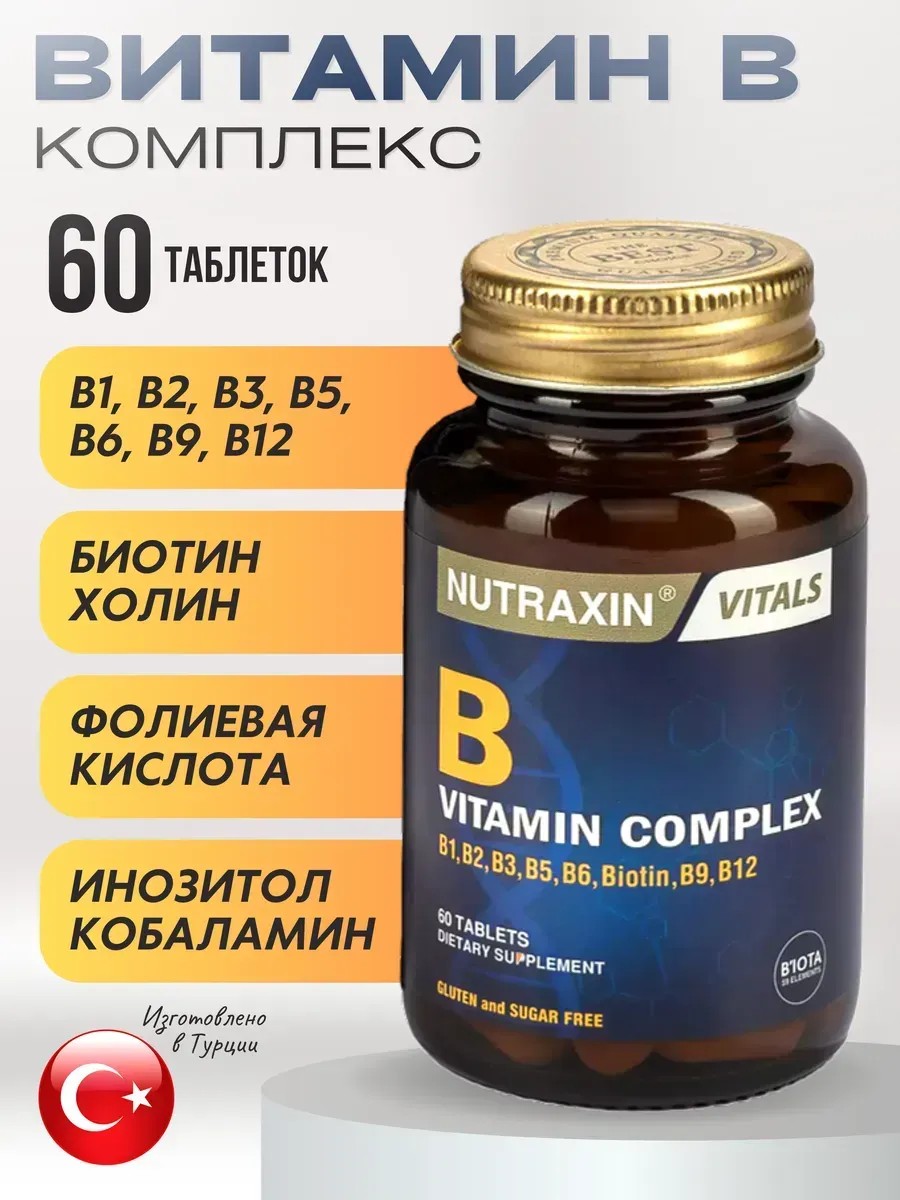 Комплекс витаминов группы B Б для женщин, мужчин и детей содержит все необходимые питательные вещества для кожи, сна или детокс и очищение организма, удобная форма капсулы для приема. В комплекс поддержит иммунитет, повысит работоспособность, укрепит нервную систему, сохранит нервы, что очень важно для женщин во время беременности. Комплекс витаминов железо, группы Б Nutraxin помогает бороться с усталостью, работает как успокоительное от стресса. Необходимы поливитамины для суставов и связок, восстановление ногтей, при избавлении от морщин для лица. Бады турецкие женские хорошо позаботятся о вашем здоровье, показывают положительное влияние для сердца и сосудов, иммунитета, а также для мозга и памяти. Банка пробиотики группы В используют как спорт питание или как спортивные добавки спортсмены. В составе мультивитамина 10 видов витамина B : b 1 - необходим для полноценного углеводного и жирового обмена в организме; b 2 - необходим для образования и сохранения целостности эритроцитов; b 3 - важный компонент тканей человека, входящий в состав никотинамидных коферментов NAD и NADP, которые являются ключевыми веществами промежуточного метаболизма; b 4 - необходим для передачи межклеточных сигналов, выведения жира из печени; b 5 - помогает сосредоточиться, повышает энергию и улучшает концентрацию. Улучшает слух и зрение, уменьшает прыщи; b 6 - необходим для нормального функционирования центральной и периферической нервной системы; b 7 - способствует поддержанию иммунной системы, полезной микрофлоры кишечника, необходим для нормальной работы щитовидной железы, помогает от выпадения волос; b 8 - улучшает состояние нервной системы, повышает защитные функции; b 9 - запускает рост новых клеток в человеческом организме и сохраняет целостность ДНК; b 12 - необходим для созревания эритроцитов. Бады B complex от известного турецкого производителя Orzax подойдет для взрослых и детей, а также бад необходим для беременных и кормящих.