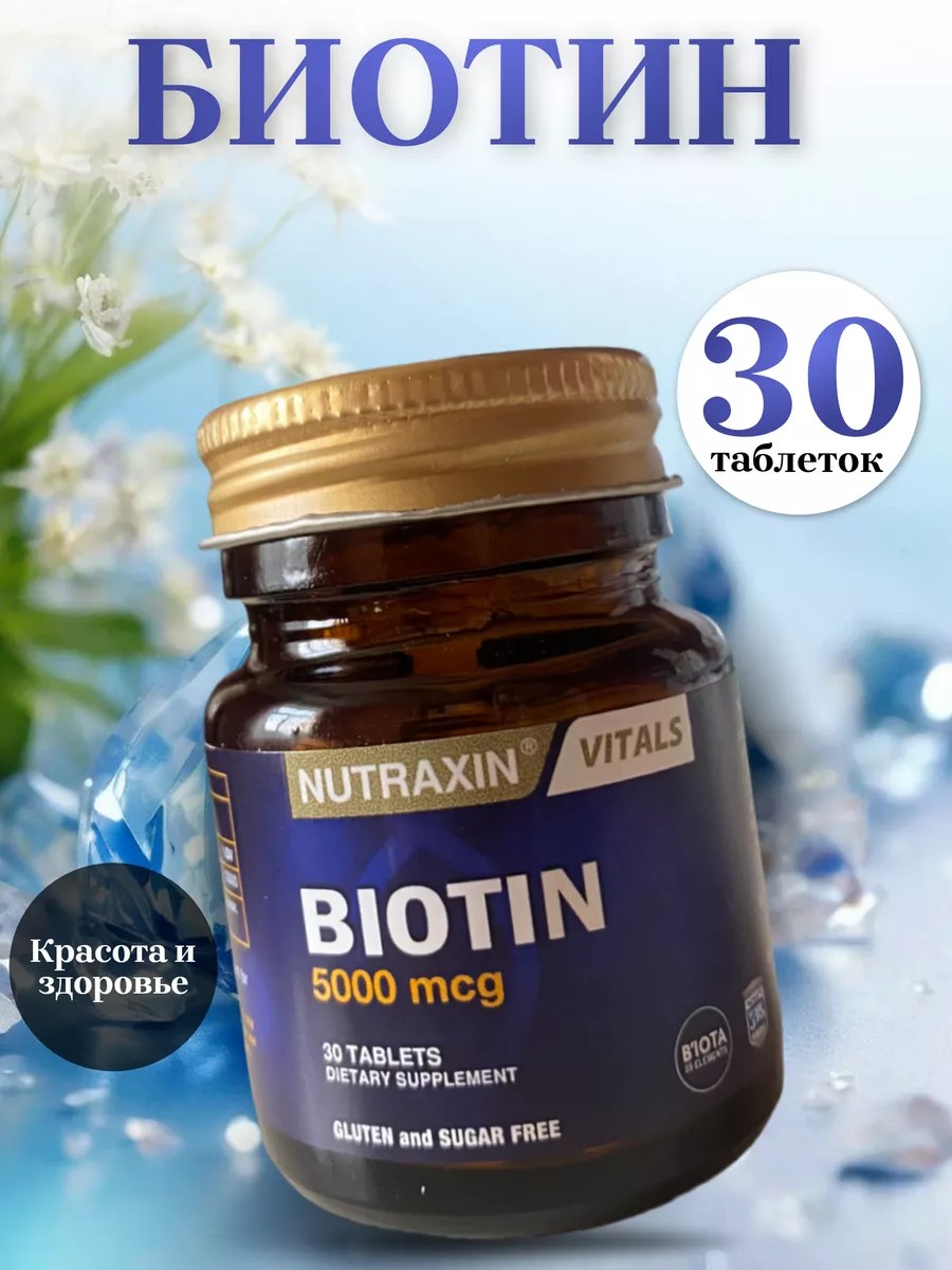 Наш нутрицевтик Биотин 5000 мкг Nutraxin это витамины для волос и ногтей, продукт, разработанный специально для поддержания правильного обмена веществ в организме. Nutraxin биотин содержит biotin 5000 мкг на одну таблетку. Это обеспечивает эффективное усвоение и максимальную пользу для вашего организма. Он разработан с использованием самых современных технологий и качественных ингредиентов, что гарантирует его качество и безопасность. Биотин относится к витаминам группы В, это хорошо изученные витамины для волосот выпадения и роста. Он является объектом множества исследований, которые подтверждают важную роль в поддержании здоровья человека. Вот несколько кратких сведений о его свойствах: Чем важен биотин для волос? Исследования доказали, что прием B7 в высоких дозировках укрепляет ослабленные и истонченные волосы по всей длине, препятствует их выпадению. Витамины для ногтей: B7 участвует в образовании кератина, основного компонента ногтей. При его нехватке ногти могут стать ломкими и хрупкими. Также прием нутрицевтика влияет на кожу: он способствует образованию жирных кислот, необходимых для здоровья кожи и помогает поддерживать ее увлажненность и упругость. Кроме того исследования связывают дефицит б7 со снижением уровня энергии и усталостью. Прием нашего комплекса может помочь повысить уровень энергии и улучшить жизненную активность. Мы собрали самые частые вопросы о комплексе. Что такое biotin? Это один из витаминов группы В. Когда ученые впервые открыли это вещество, они назвали его «витамин Н», что означает «Haar und Haut» – в переводе с немецкого «волосы и кожа». Как проверить уровень в организме? Для оценки уровня нутрицевтика в организме человека проводится анализ крови на B7. В качестве дополнительной диагностики могут также быть назначены такие лабораторные исследования, как анализы ногтей. Чем полезен биотин для волос? Он способствует укреплению волосяных фолликулов, препятствует преждевременному выпадению. При этом дополнительно придает блеск и делает локоны более послушными, что облегчает процесс укладки. Зачем принимать B 7 отдельно, если он есть в составе многих комплексовот выпадения волос для женщин?Действительно, витамин В7 входит в состав многих препаратов. Например, вы можете найти его в нашем комплексе витамины группы В Nutraxin. Однако, если нужен эффект укрепление волос и ногтей его необходимо принимать в высокой дозировке, желательно, как монопрепарат. Как правильно принимать? В качестве пищевой добавки взрослым рекомендуется принимать по 1 таблетке в день.