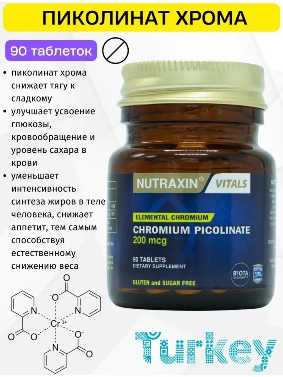 The main function of this mineral is to regulate blood glucose levels. It does not increase insulin levels, but enhances the effectiveness of any existing insulin. Insulin regulates blood sugar levels, controls the rate of absorption of certain amino acids into the bloodstream, and is one of the body's most powerful anabolic hormones. Since chromium increases the effectiveness of insulin, it also promotes protein synthesis. Regular intake of the mineral reduces the intensity of fat synthesis in the human body, reduces appetite, thereby promoting natural weight loss. Take 1 tablet daily with meals. Chromium picolinate 200chromium 200nutraxin, blood flow, for blood, Turkish, chromium mineral, chromium picolinate, chromium picolinate, chromium, with chromium, chromium picolinate, health levels, blood, insulin and health, to lower blood sugar