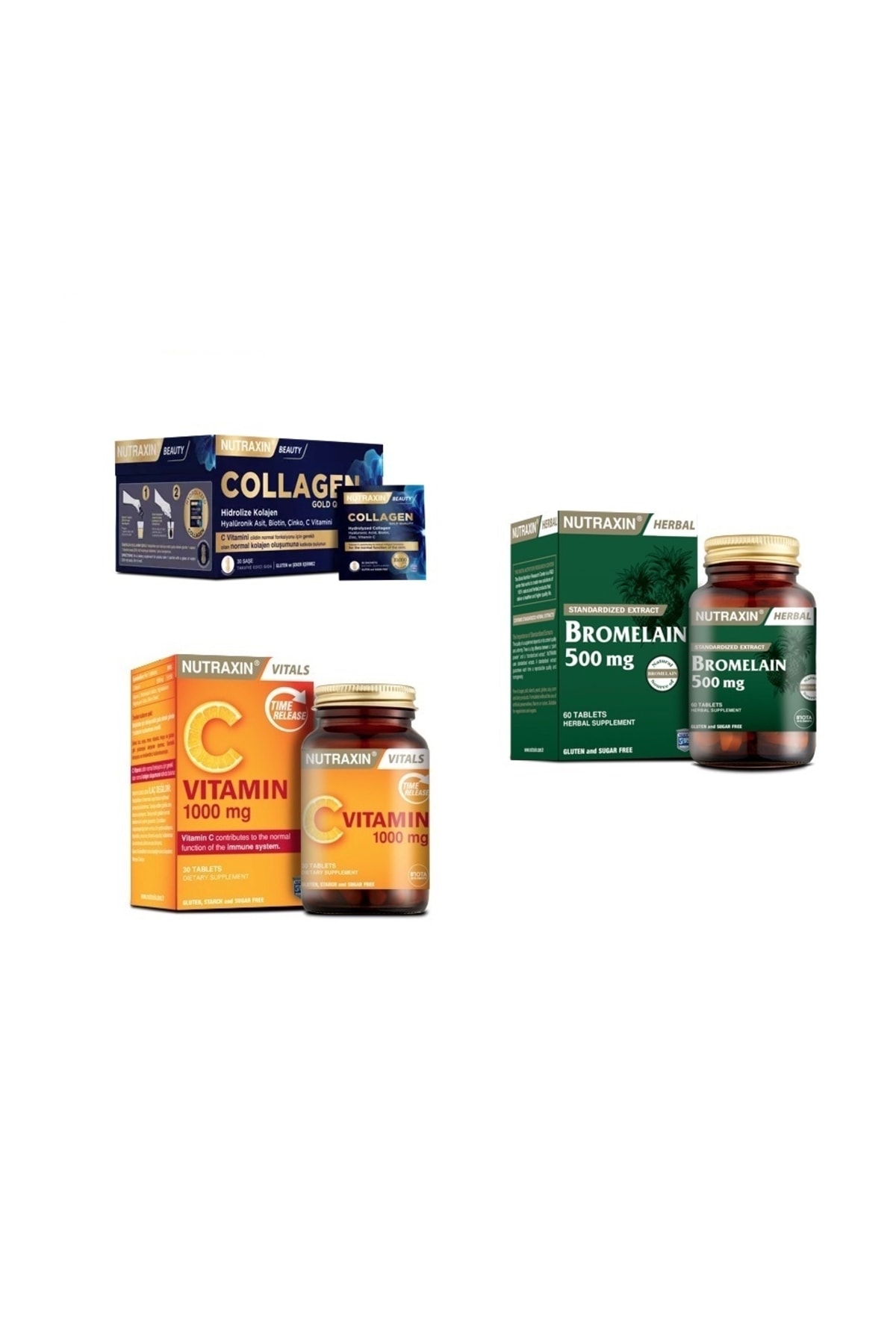 Nutraxin Collagen 30 Sachet 10000 Mg + Bromelain 60 Capsules + Vitamin C 1000 Mg 30 Tablets