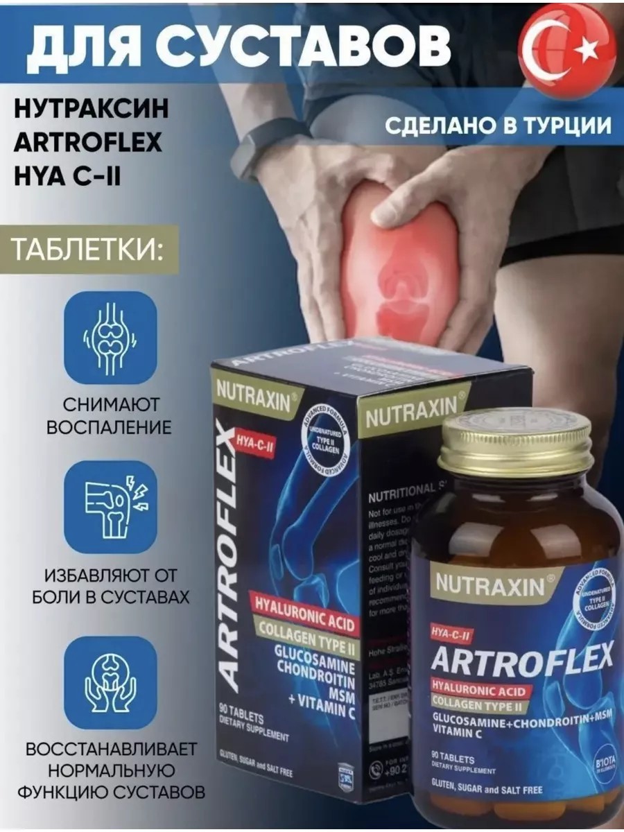 Препарат Нутраксин Artroflex Hya C-II в таблетках для суставов и связок, эффективно укрепляет опорно-двигательный аппарат, комплекс для спортсменов. БАД для опорно-двигательной системы и костей, профилактика перенапряжения мышц и болезней костей. Это специальный продукт из серии глюкозаминов, который содержит 6 активных ингредиентов: Глюкозамин, Коллаген 2-го типа, Гиалуроновая кислота, Витамин С , хондроитин , Метилсульфонилметан (МСМ). Глюкозамин - это основа в составе Артофлекс. Вещество вырабатываемое хрящевой тканью. Улучшает состояние суставов, снимает боли. Влияет на отложение кальция в костной ткани. Восстанавливает нормальную функцию суставов. Особенно улучшение и пользу глюкозамина отмечают спортсмены после травм. Ее рекомендуют при остеоартрите и других ревматологических болезнях. ОН препятствует развитию разрушительных процессов в клетках сустава.Коллаген - это белки, вырабатываемые организмом, которые отвечают за упругость и связку тканей. Именно дефицит коллагена приводит к старению кожи, костей и суставов. В нашем случае продукт содержит коллаген 2-го типа, отвечающий за гибкость и прочность суставов, а также здоровье хрящей. Коллаген данного типа рекомендуются при артрите, ревматизме и других суставных заболеваниях. Гиалуроновая кислота - это важный компонент суставного хряща и вырабатывается человеческим организмом. В каждой клетке она в виде оболочки, закрывает их и удерживает влагу. В современной медицине ее используют для лечения ревматических болезней. Важное его свойство, что она является смазкой для суставов. Витамин С в Артрофлекс или аскорбиновая кислота. Один из основных веществ в рационе человека отвечающий за функционирования соединительной и костной ткани. Поступает в организм только с пищей. Например фрукты или добавки к пище. Очень сильный антиоксидант. Помогает при болевых ощущениях в нижних конечностях. Именно поэтому она в составе Нутраксин Artroflex. Хондроитин - вещество вырабатываемый хрящевой тканью суставов. Он так же как и глюкозамин входит в состав жидкости суставов, то есть смазки. Интересно, если в этой жидкости не хватает глюкозамина образуется недостаток хондроитина. В последствие хруст в суставах и ухудшение качества смазки или синовиальной жидкости. Хондроитин снижает потерю кальция и улучшает фосфорно-кальциевый обмен в хрящевой ткани. МСМ это сера, которая вырабатывается в суставах, она помогает амортизировать силу удара при движении. Употребляется для лечения или профилактики остеоартрита. Является пищевой добавкой. Не содержит потенциальных аллергенов, таких как сахар, соль, крахмал, дрожжи. Нет в составе глютена, соя, кукуруза и молочные продукты и синтетических красителей, ароматизаторов и консервантов. Способ применения Артрофлекс рекомендуется принимать по 1 таблетке 3 раза в день, запивая большим количеством воды. Противопоказан до 18 лет. Если прием длится более 3 месяцев, следует проконсультироваться с врачом.