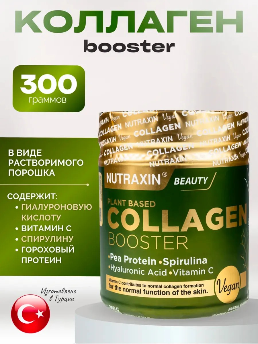 Нутраксин веганский коллаген бустер; Содержит гороховый протеин, экстракт спирулины, экстракт семян чиа, рисовый крахмал, гиалуроновую кислоту, бромелайн, ресвератрол, витамин С, витамин В12, железо и цинк.
