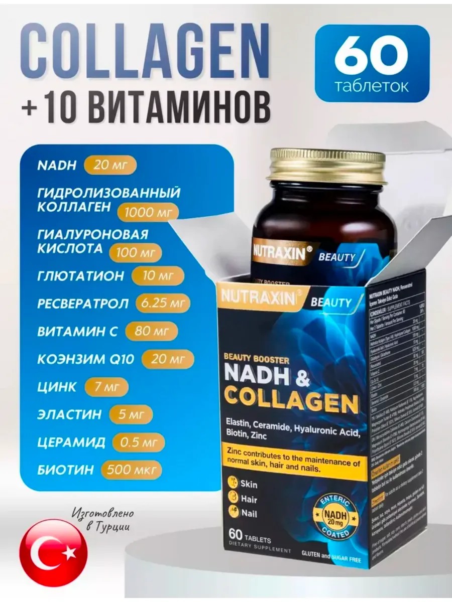 Nutraxin Beauty Booster НАДХ И КОЛЛАГЕН; Он содержит гидролизованный коллаген типа I и типа III, НАДН, гиалуроновую кислоту, эластин, церамид, ресвератрол, витамин С, Co Q-10, глутатион, цинк и биотин.