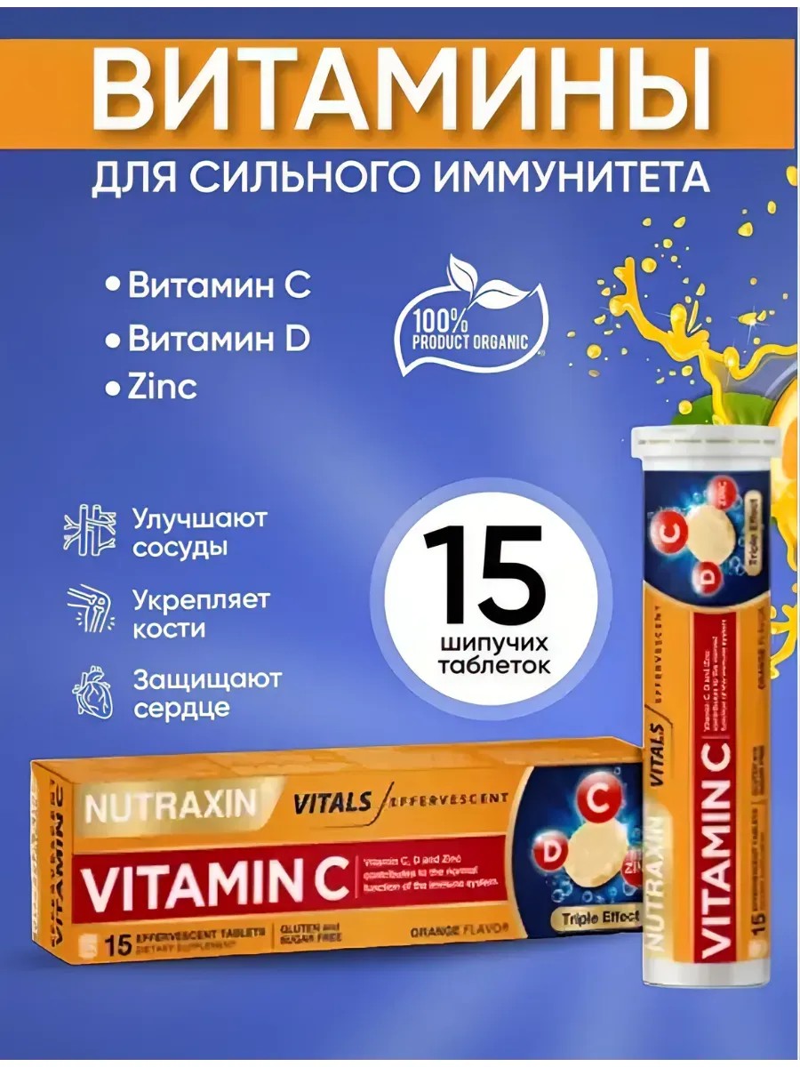 Nutraxin Vitamin C D ZINC входят три мощных компонента: витамин С, витамином D и цинк. Защитные силы организма укрепляет витамин С - злейший враг вирусов, возбуждающих простудные заболевания. Он усиливает выработку белков интерферонов, которые вступают в борьбу с вирусами одними из первых. Обладает противовоспалительными свойствами, способствует нейтрализации свободных радикалов и защите клеток легких от их агрессивного воздействия. Витамин С повышает сопротивляемость организма инфекциям, интоксикациям химическими веществами, перегреванию, охлаждению, кислородному голоданию. Под его влиянием увеличивается эластичность и прочность капиллярных сосудов. Витамин D является уникальным адаптивным иммуномодулятором. Он усиливает врожденный иммунитет, активизирует антимикробные пептиды, которые устраняют патогенные организмы такие как микробы, бактерии и вирусы. Витамин D укрепляет клеточный иммунитет, снижает уровень «цитокинового шторма», а также под20 шипучих таблеток 105 держивает функцию легких, уменьшая воспалительную реакцию, вызванную вирусами. Помимо этого, он также стимулирует выработку антимикробных белков в слизистых оболочках верхних дыхательных путей. Цинк – одно из немногих веществ, которое влияет одновременно на все звенья иммунитета человека. Он повышает выработку интерферонов – белков, которые первыми встают на защиту организма против инфицирования вирусами, бактериями и другими микроорганизмами. Цинк препятствует распространению вируса в клетке, защищает от разрушения лимфоциты. Также он усиливает функции тимуса (вилочковой железы), который иногда даже называют «сердцем иммунной системы» за счет способности производить новые Т-клетки. Именно они, в свою очередь, распознают вирусы и нейтрализуют их. Nutraxin Vitamin C D ZINC - шипучие таблетки с апельсиновым вкусом, которые моментально растворяются в стакане воды. В жидкой форме витамины быстрее проникает в кровь, легко усваивается организмом, не вызывая раздражения желудка. Удобный прием для тех, кто испытывает проблемы с глотанием.