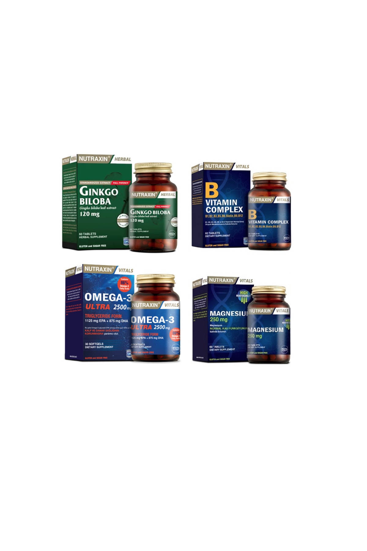 Nutraxin Ginkgo Biloba 60 Tablets +omega 3 Ultra 2500 Mg 30 Capsules B Vitamin Complex +magnesium