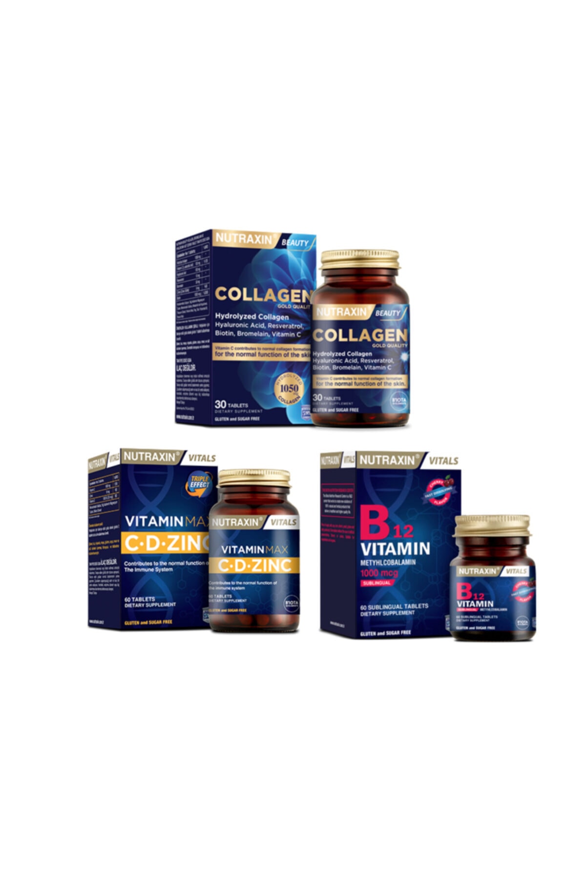 Nutraxin Hydrolyzed Collagen Hyaluronic Acid 30 Tablets + Vitamin Max (c d Zinc) 60 Tablets + Vitamin b12 60 Sublingual