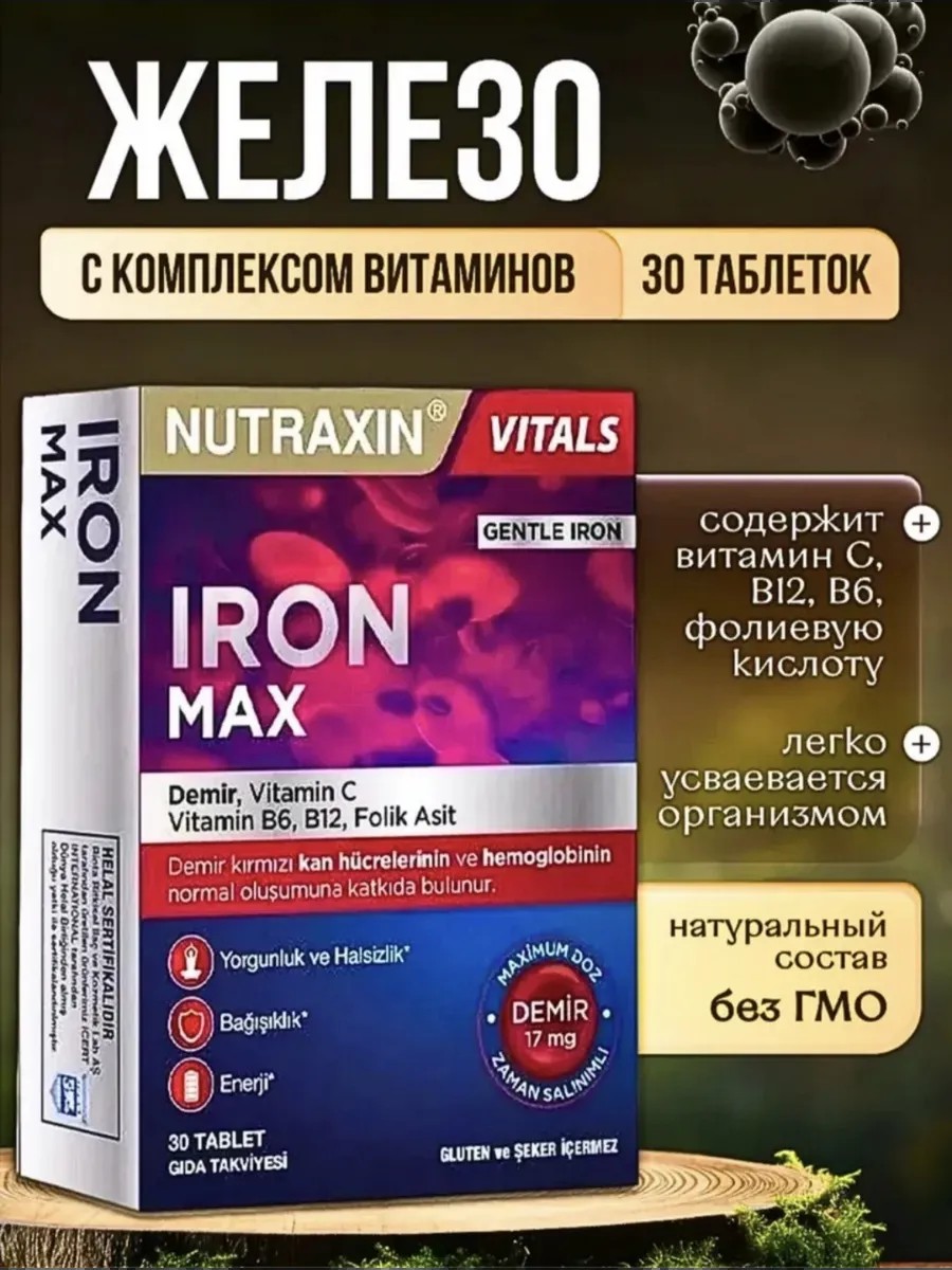 "Nutraxin Iron Max" - это продвинутая формула, спроектированная для поддержания оптимального уровня железа в организме с помощью бисглицината железа, обогащенного витаминами C, B6 и B12. Основные характеристики: 1. Бисглицинат железа: Высоко усваиваемая форма железа обеспечивает эффективное усвоение и минимизирует негативные эффекты на пищеварительную систему. Это особенно важно для тех, кто сталкивается с дефицитом железа или анемией. 2. Витамин C: Присутствие витамина C в формуле помогает усвоению железа, повышая его биодоступность. Витамин C также является мощным антиоксидантом, поддерживающим иммунную систему и стимулирующим производство коллагена для здоровой кожи и соединительных тканей. 3. Витамины B6 и B12: Эти витамины важны для поддержания нормального обмена веществ, кроветворения и нервной системы. Они могут помочь повысить уровень энергии и общее физическое самочувствие. Преимущества: Усвоение и толерантность: Бисглицинат железа предоставляет мягкое и постепенное усвоение железа без значительных нежелательных эффектов, связанных с другими формами железа. Эффективность: Комбинация витаминов C, B6 и B12 помогает не только в усвоении железа, но и обеспечивает полноценную поддержку обмена веществ и общего состояния организма. Иммунная система и здоровье кожи: Витамин C укрепляет иммунную систему, а также поддерживает здоровье кожи и соединительных тканей. Энергия и нервная система: Витамины B6 и B12 способствуют поддержанию нервной системы и повышают уровень энергии. Использование: Проконсультируйтесь с медицинским специалистом перед началом использования. Рекомендованная доза и продолжительность приема могут варьироваться в зависимости от ваших индивидуальных потребностей и состояния здоровья. "Nutraxin Iron Max" - ваш путь к поддержанию здоровья железа, энергии и общего благополучия.
