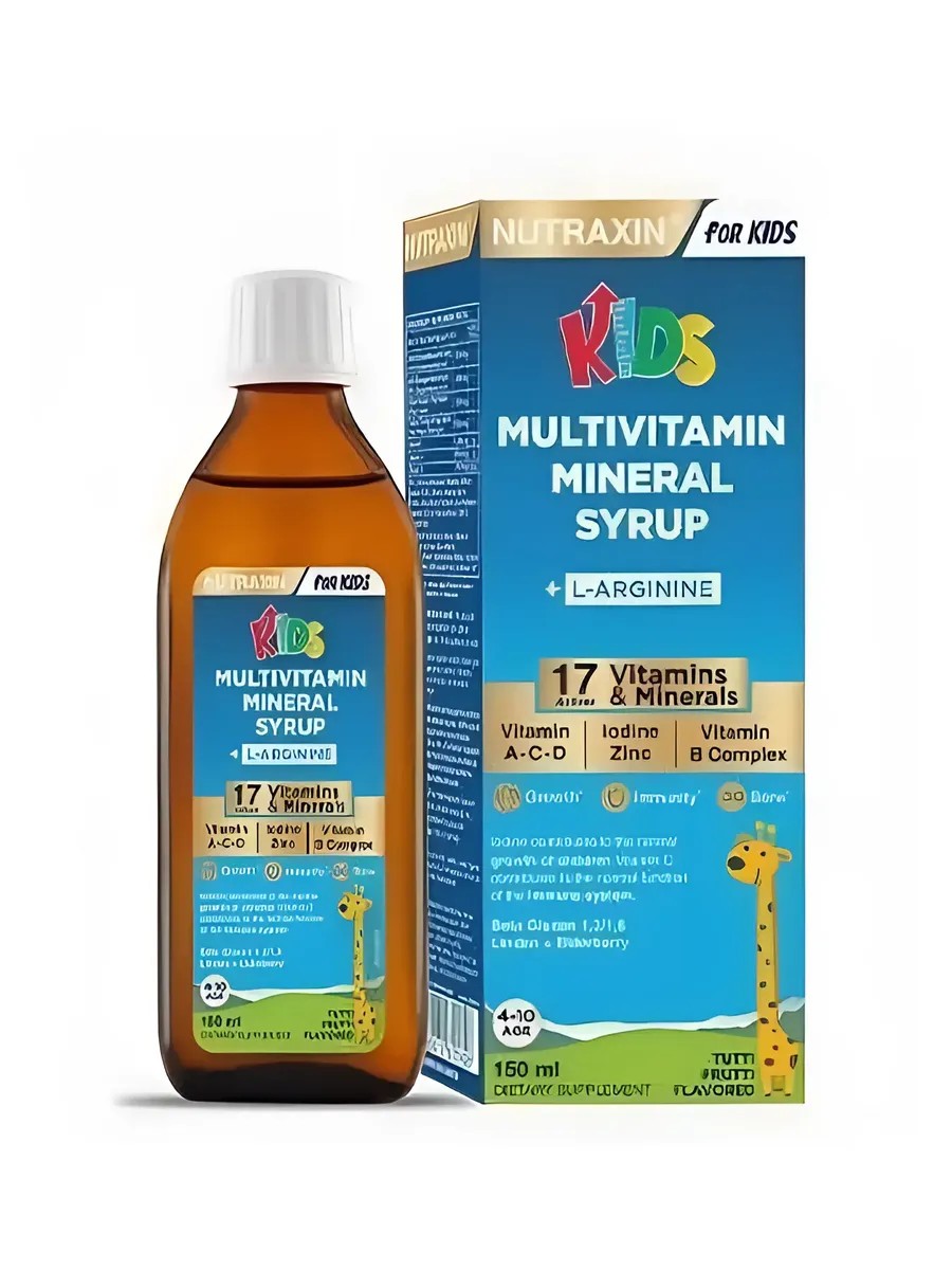 Nutraxin KIDS Мультивитаминный минеральный сироп 150 мл; Содержит 17 витаминов и минералов, а также L-аргинин. Содержащиеся в нем активные ингредиенты поддерживают рост и иммунитет детей.