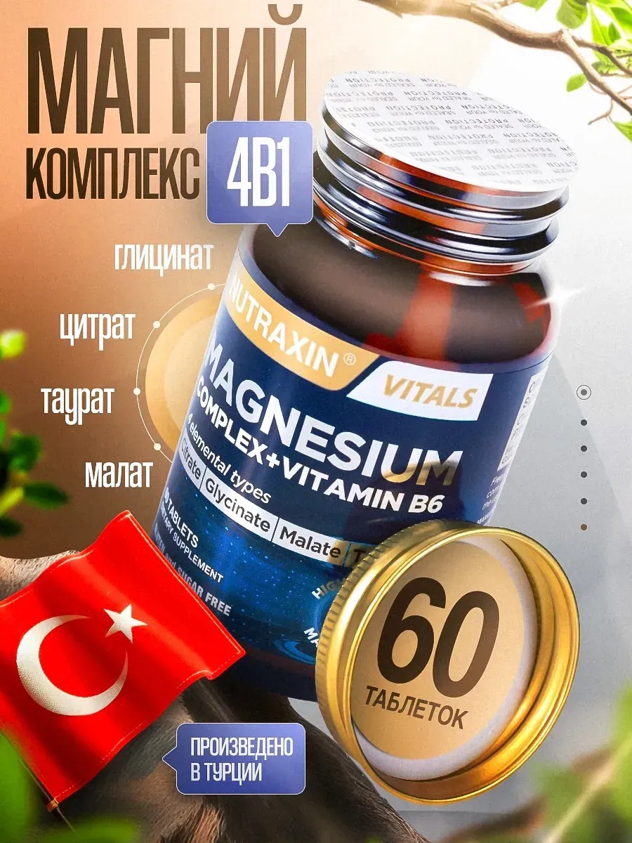 Витамины Магний 4 в 1 от турецкого бренда Нутракснин Nutraxin для женщин, мужчин и детей - комплексный продукт, разработанный специально для тех, кто следит за хорошим самочувствием, необходим для роста волос и помогает против их выпадения, для кожи лица и избавление от морщин или детокс, а также очищение кишечника . Бады способствуют снижению усталости и утомляемости, нормальному энергетическому метаболизму, спокойствию, электролитному балансу, сохранению здоровья костей и зубов. Препарат цинк глицинат магния содержит уникальную группу четырех форм липосомального магния. Цитрат налаживает пищеварение и легко усваивается женским и мужским организмом, как и бисглицинат. Малат и железо известен способностью снижать уровень молочной кислоты в мышцах, что может привести к уменьшению болей и покалываний после спортивных упражнений. Таурат обладает успокаивающими свойствами. Бады хорошо влияют для печени, сердца и суставов, а еще от давления. Биодобавка содержит витамин В6 (пиридоксаль-5-фосфат). Он играет важную роль в обмене веществ, контролирует работу нервной системы, сердца и иммунитета. Vitamin б 6 участвует в производстве нейротрансмиттеров, в том числе серотонина, отвечающего за настроение и сон. Фосфатидилхолин в бадах содействует оптимальному функционированию клеток и тканей. Витаминный набор улучшает память, концентрацию, помогает устранить сонливость и бессонницу. Благодаря успокоительному эффекту минерала, рекомендуется людям, постоянно испытывающим тревогу, депрессию и стресс. Мультивитамин в таблетках подходит для взрослых женщин, мужчин, пожилых и подростков. Противопоказания пищевой добавки включают индивидуальную непереносимость компонентов, периоды беременности и кормления грудью. Баночку витаминов Магний можно использовать как спортивное питание или добавку к спорт питанию для спортсменов за счет своих функций. Кормящим мамам и беременным девушкам следует обязательно проконсультироваться с врачом, перед началом приема внутрь капсул. Заказывайте комплекс, произведенный в Турции, проявляйте заботу о себе и наслаждайтесь прекрасными результатами!