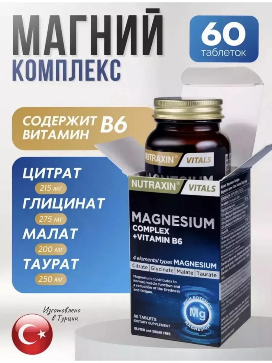 | Полное наименование товара | Nutraxin magnesium Complex(малат, глицинат,таурат,цитрат) +В6 |