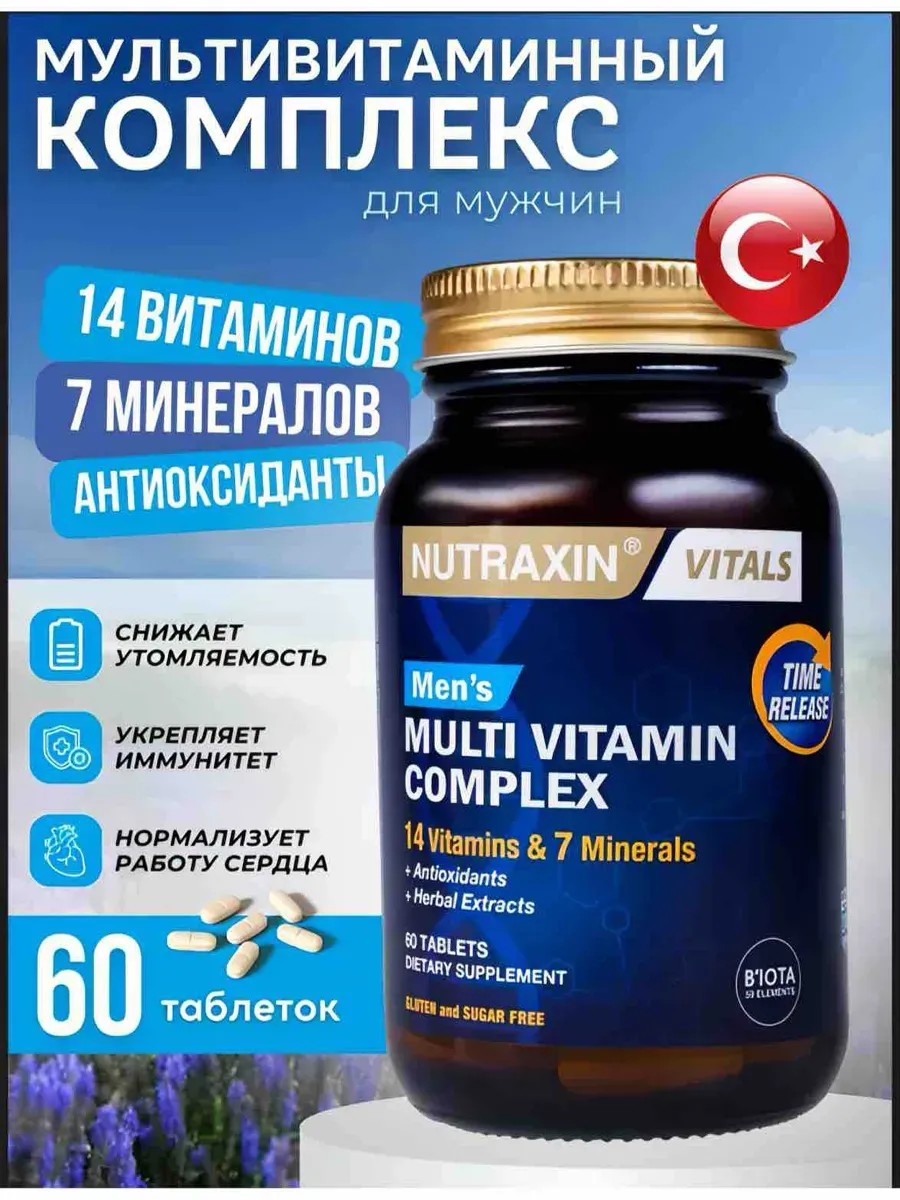 Nutraxin Mens Multi Vitamin Complex is a vitamin and mineral complex with a special formula of essential elements for men. As we know, any body with a vitamin and nutrient deficiency experiences problems. This affects well-being, potency, and performance, leading to illness and many other consequences. And all this also has a cumulative effect. Therefore, it is essential to nourish the body with beneficial vitamins. Taking Nutraxin Mens Multi Vitamin Complex helps boost immunity, support healthy hair and skin, normalize the functions of the cardiovascular system, liver, and gastrointestinal tract, and improve brain function. In addition, this men's vitamin complex helps with nervous disorders, stress, irritability, and similar conditions. Take 1 tablet 2 times daily with meals, drinking plenty of water. Contraindicated for use under 18 years of age. Hypersensitivity to any of the ingredients. This is not a medicinal product. Do not exceed the stated recommended daily dose. Individuals taking medications or undergoing medication treatment should consult a physician before using this product. Do not use this supplement if you are under 18 years of age.