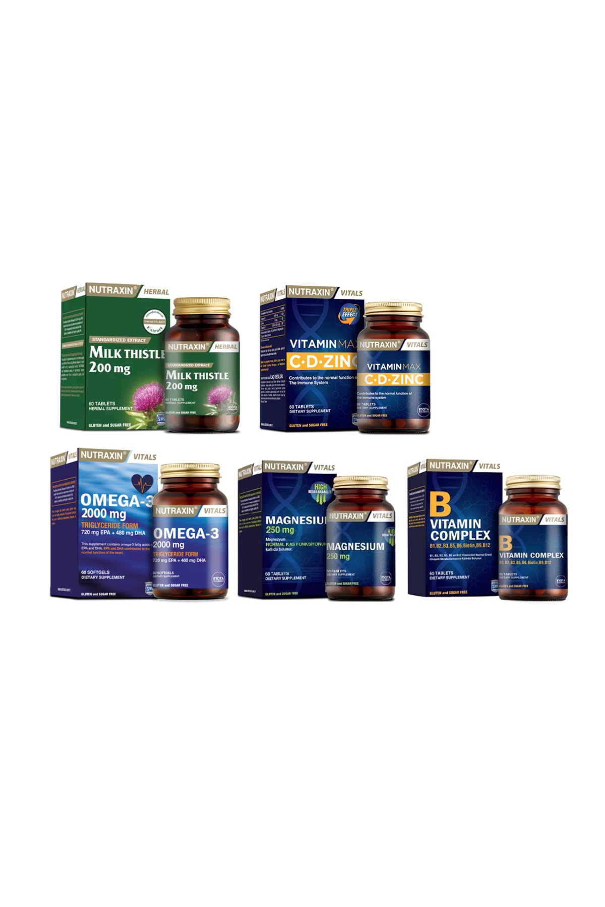 Milk Thistle 200 mg 60 Tablets (Milk Thistle (Silybum marianum) Seed Extract 200 mg) Nutraxin Milk Thistle contains the extract of the milk thistle plant, also known as camel thistle, wild artichoke, and virgin thistle. Camel thistle, whose active ingredient is silymarin, is a traditional herbal species used for more than 2000 years. Nutraxin Milk Thistle contains 80 silymarin. Directions for Use: It is recommended that adults take 1-4 tablets daily with plenty of water as a food supplement. ------------------------------------ "Nutraxin Omega 3 Fish Oil 2000 mg 60 SoftGel: Nutraxin Omega-3 2000 mg It is fish oil containing EPA and DHA omega-3 fatty acids. Omega-3 2000 mg does not contain heavy metals. It has GOED certification. "EPA and DHA contribute to the normal function of the heart." ------------------------------------------------ Nutraxin Vitamin Max (Vitamin C, Vitamin D and Zinc Supplement) 60 Tablets Nutraxin Vitamin Max offers three powerful ingredients together with Vitamin C, Vitamin D and Zinc. It contains 1000 mg of Vitamin C, 1000 IU of Vitamin D and 10 mg of zinc. "Vitamin C contributes to the normal function of the immune system." "Vitamin D contributes to the normal function of the immune system." "Zinc contributes to the normal function of the immune system." Every 2 Tablets Vitamin C - 1000 mg Vitamin D - 1000 IU Zinc - 10 mg Usage It is recommended to use 2 tablets a day with plenty of water as a food supplement for adults. Other Ingredients Microcrystalline Cellulose, Magnesium Salts of Fatty Acids, Silicon Dioxide Information: It does not contain sugar, salt, yeast, starch, gluten, soy, corn and dairy products. No color, preservative and sweetener has been used. Suitable for vegetarians and vegans. Our products are 0 Original. -------------------------------------- Nutraxin B Vitamin Complex 60 Tablets: Nutraxin B Complex is a mixture of vitamins B1, B2, B3, B5, B6, B12 along with folic acid, biotin, choline, and inositol. "Thiamine (Vitamin B1) contributes to normal energy-yielding metabolism." "Riboflavin (Vitamin B2) contributes to the reduction of tiredness and fatigue." "Niacin contributes to the maintenance of normal skin." "Vitamin B6 contributes to normal protein and glycogen metabolism." "Vitamin B12 contributes to normal homocysteine metabolism." "Choline contributes to the maintenance of normal liver function." Usage: It is recommended for adults to take 1 tablet a day as a food supplement, preferably at mealtimes, with plenty of water. Product Details: Each 1 Tablet contains Vitamin B1 (Thiamine hydrochloride) - 50 mg Vitamin B2 (Riboflavin) - 50 mg Vitamin B3 (Niacinamide) - 50 mg Vitamin B5 (Pantothenic Acid) - 50 mg Vitamin B6 (Pyridoxine hydrochloride) - 10 mg Vitamin B12 (Cobalamin) - 50 mcg Folic Acid - 400 mcg Biotin (Vitamin B7, Vitamin H) - 300 mcg Choline Bitartrate - 25 mg Inositol - 50 mg OTHER Ingredients: Microcrystalline cellulose, Silicon Dioxide, Magnesium Salts of Fatty Acids Information: It does not contain potential allergens such as sugar, salt, starch, yeast, gluten, soy, corn and dairy products. No synthetic colorants, sweeteners and preservatives are used. ------------------------------------- Nutraxin Magnesium 250 mg 60 Tablets: Nutraxin Magnesium Citrate contains 250 mg of magnesium mineral. "Magnesium contributes to the reduction of tiredness and fatigue." "Magnesium contributes to electrolyte balance." "Magnesium contributes to normal energy-yielding metabolism." "Magnesium contributes to normal muscle function." "Magnesium contributes to normal protein synthesis." "Magnesium contributes to the maintenance of normal bones." "Magnesium contributes to the maintenance of normal teeth." "Magnesium has a role in cell division." Usage: It is recommended to use 1 tablet a day with plenty of water as a food supplement for adults. Product Details: In each 1 Tablet Magnesium (Citrate) - 250 mg Other Ingredients: Polyvinylpyrrolidone, Titanium Dioxide, Magnesium Salts of Fatty Acids, Silicon Dioxide Information: Does not contain potential allergens such as sugar, salt, starch, yeast, soy, corn, gluten, and dairy products. No synthetic preservatives or sweeteners have been used. Our products are 100 Original.