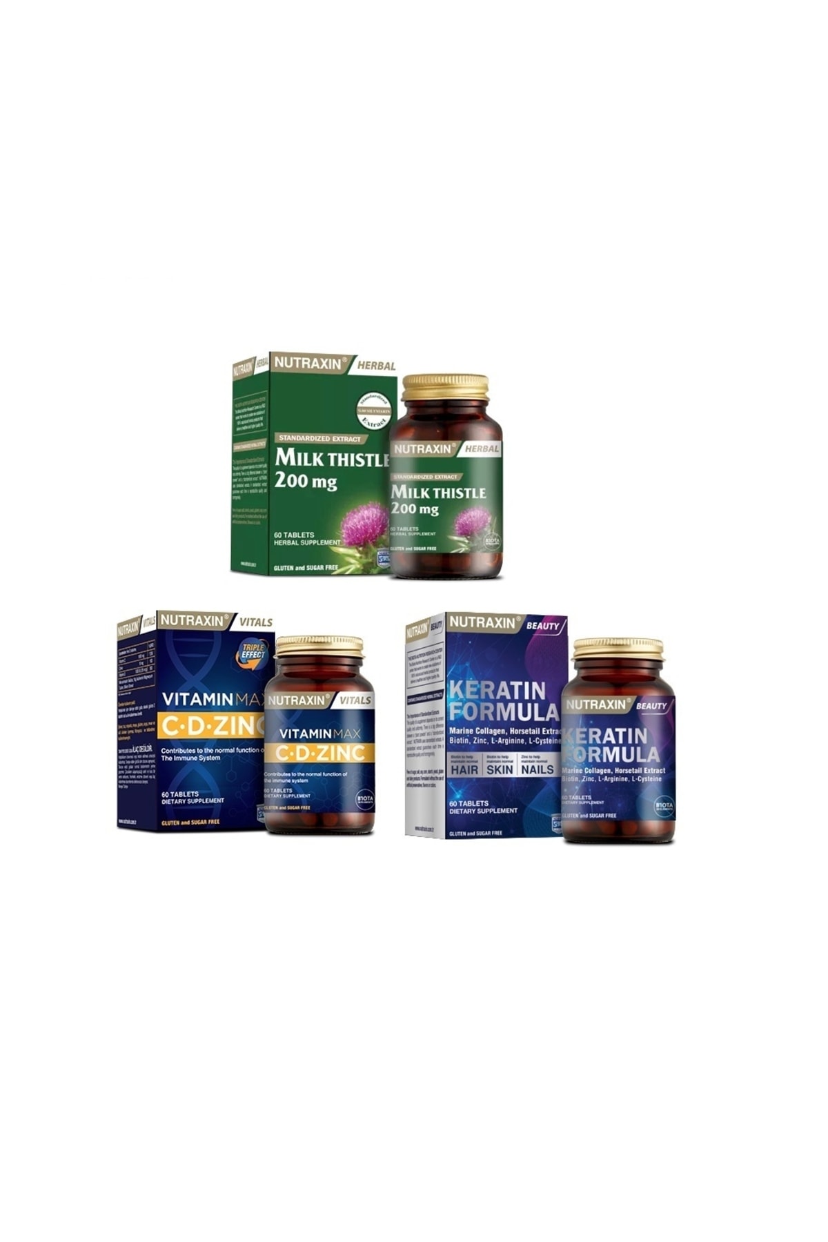 Nutraxin Milk Thistle 60 Tablets + Vitamin Max (c d zinc) 60 Tablets + Keratin for Hair and Nails