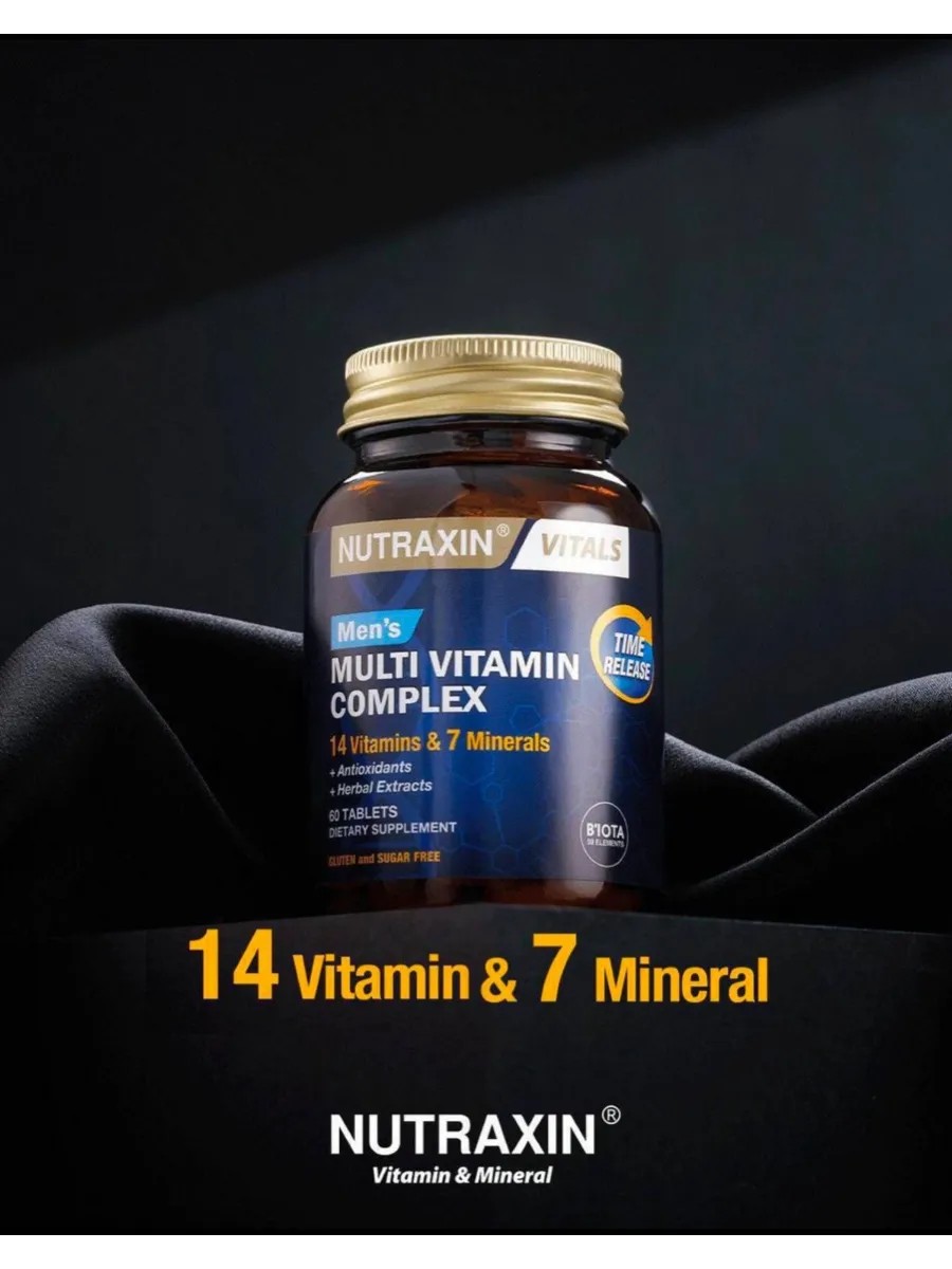 Nutraxin Mens Multi Vitamin Complex is a vitamin and mineral complex with a special formula of essential elements for men. As we know, any body with a vitamin and nutrient deficiency experiences problems. This affects well-being, potency, and performance, leading to illness and many other consequences. And all this also has a cumulative effect. Therefore, it is essential to nourish the body with beneficial vitamins. Taking Nutraxin Mens Multi Vitamin Complex helps boost immunity, support healthy hair and skin, normalize the functions of the cardiovascular system, liver, and gastrointestinal tract, and improve brain function. In addition, this men's vitamin complex helps with nervous disorders, stress, irritability, and similar conditions. Take 1 tablet 2 times daily with meals, drinking plenty of water. Contraindicated for use under 18 years of age. Hypersensitivity to any of the ingredients. This is not a medicinal product. Do not exceed the stated recommended daily dose. Individuals taking medications or undergoing medication treatment should consult a physician before using this product. Do not use this supplement if you are under 18 years of age.