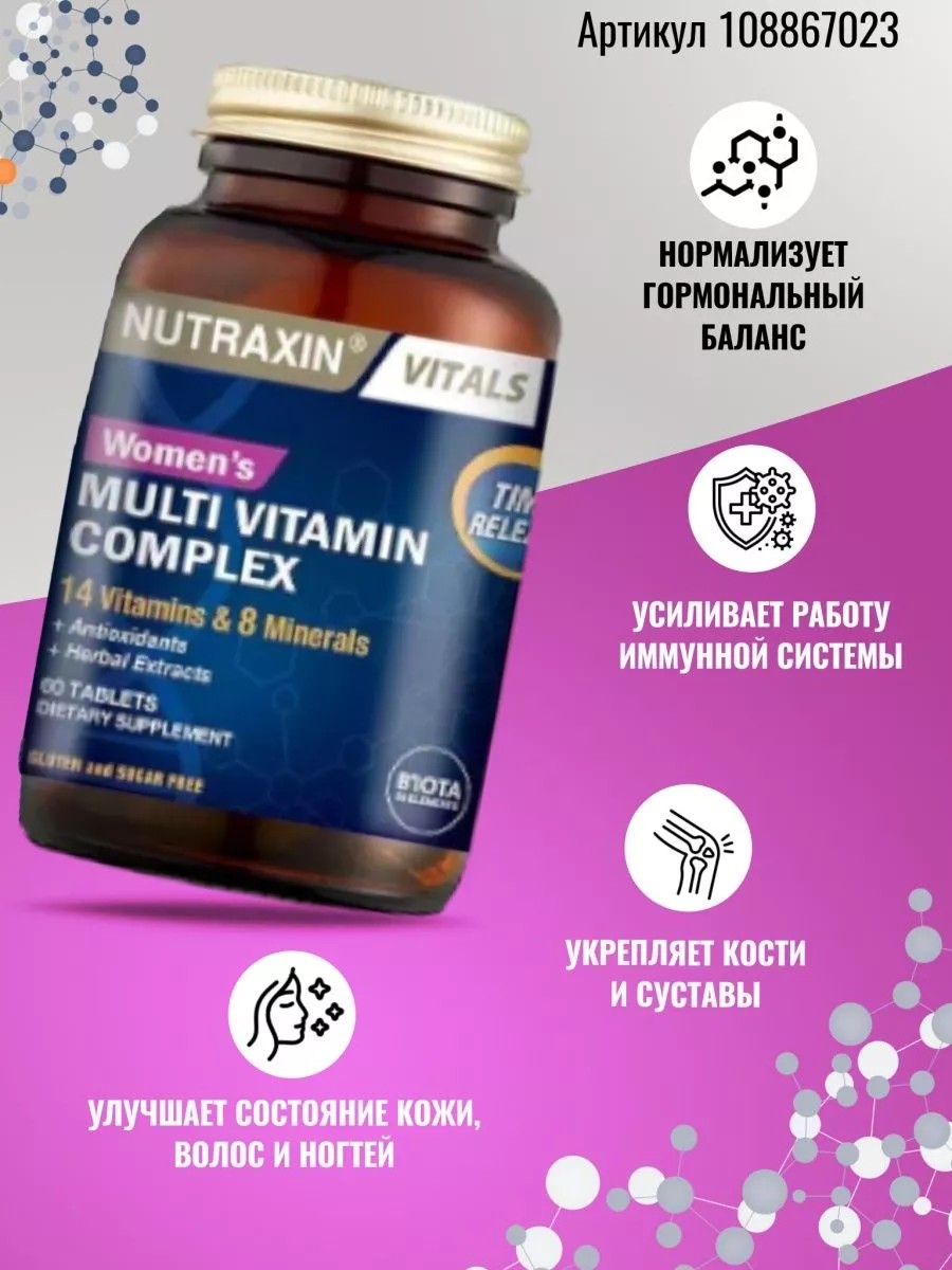 Nutraxin мультивитаминый комплекс для женщин - это специальная форма, в составе которой 14 витаминов, 8 минералов.1.Комплекс витаминов поддерживает женское здоровье на должном уровне, способствует максимально быстрому и эффективному усвоению всех полезных витаминов и микро-элементов.2.Комплекс оказывает общеукрепляющее действие и улучшает общее самочувствие.3.Поддерживает иммунитет.4.Нормализует гормональный баланс. 5.Улучшает состояние кожи, волос и ногтей. 6.Укрепляет кости и суставы. Рекомендуется принимать по 2 таблетки в день, запивая большим количеством воды.Womens MULTI VITAMIN COMPLEX / Женский мультивитаминный комплекс / 14 витаминов и 8 минералов