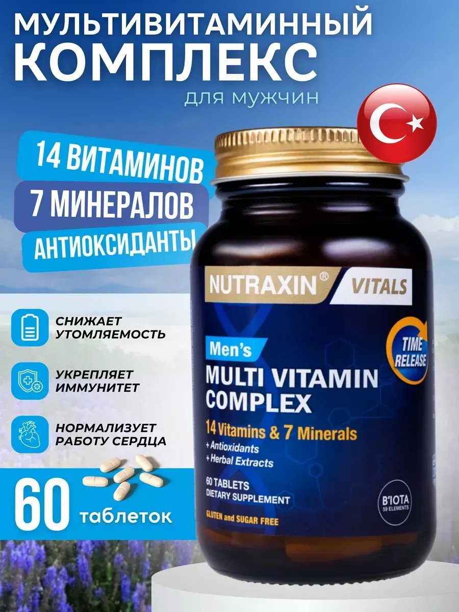 Multivitamin complex for men. Nutraxin Multivitamin and Mineral Complex; This special formula contains essential vitamins, minerals, and herbs for men. This multivitamin and mineral complex, suitable for daily use, comes in a timed-release tablet. Zinc helps maintain normal testosterone levels in the blood. Biotin supports normal hair. Adults are recommended to take 2 tablets daily with plenty of water. Multi Vitamin complex Men's* Vitamin A (beta-carotene) 1000 IU* Vitamin B1 (thiamine mononitrate)* Vitamin B2 (riboflavin)* Vitamin B3 (niacinamide)* Vitamin B5 (pantothenic acid)* Vitamin B6 (pyridoxine)* Vitamin B7 (D-biotin)* Vitamin B9 (folic acid)* Vitamin B12 (methylcobalamin)* Choline (choline bitartrate)* Inositol* Vitamin C (L-ascorbic acid)* Vitamin D3400 IU* Vitamin E 10 IU* Copper sulfate)* Zinc (sulfate)* Calcium carbonate)* Chromium picolinate* Manganese (sulfate)* Molybdenum (sodium molybdate)* Selenium (L-selenomethionine)* Alpha-lipoic acid* Bilberry extract (Vaccinum myrtillus)* Green tea extract (Camellia sinensis)* Tomato extract (Solanum lycopersicum)* Korean ginseng extract (Panax ginseng)* Saw palmetto extract (Serenoa repens)* Pumpkin seed extract (cucurbita sp.)* Stinging nettle root extract (urtica dioica)* Vitamins are biologically active substances necessary for the normal functioning of the body. They promote proper metabolism, increase performance, endurance, and resistance to infections. Minerals are a general term denoting biologically important components of inorganic (non-living) origin, which in small quantities are necessary for the normal functioning of the body: the functioning of muscles and nerves, maintaining the strength of bones and teeth, the production of red blood cells, and many other functions. As with most vitamins, our bodies cannot produce minerals on their own, so they must be consumed through food on a regular basis.